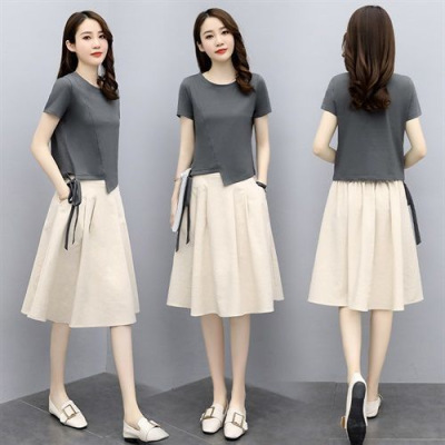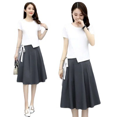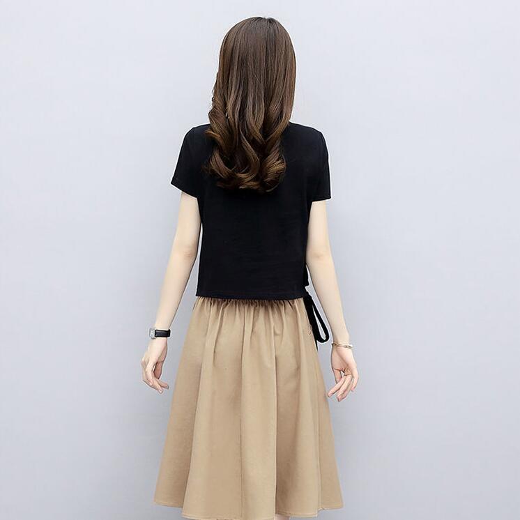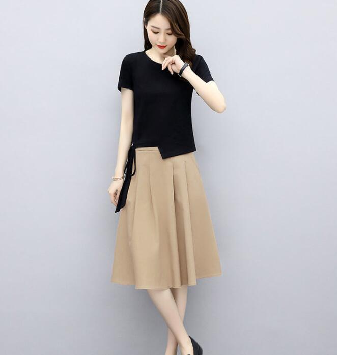 Color: black T + khaki skirt, beige T + blue skirt, gray T + rice apricot skirt, white T + gray skirt
