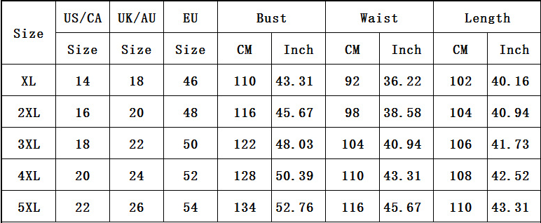 Size: XL-US14, 2XL-US16, 3XL-US18, 4XL-US20, 5XL-US22