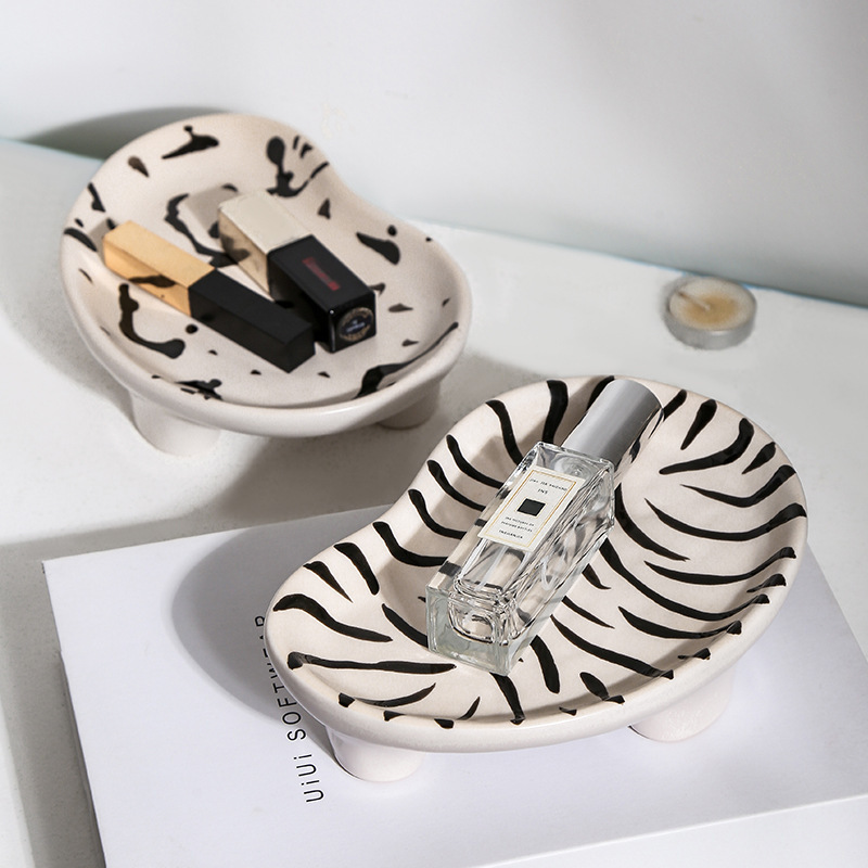 Name: hand-painted irregular shaped ceramic multi-function trayMaterial: ceramicColor: leopard print, zebra, splash ink, cloudSize: 5.4 * 13 * 19.5cmShape: irregularMicrowave oven: available