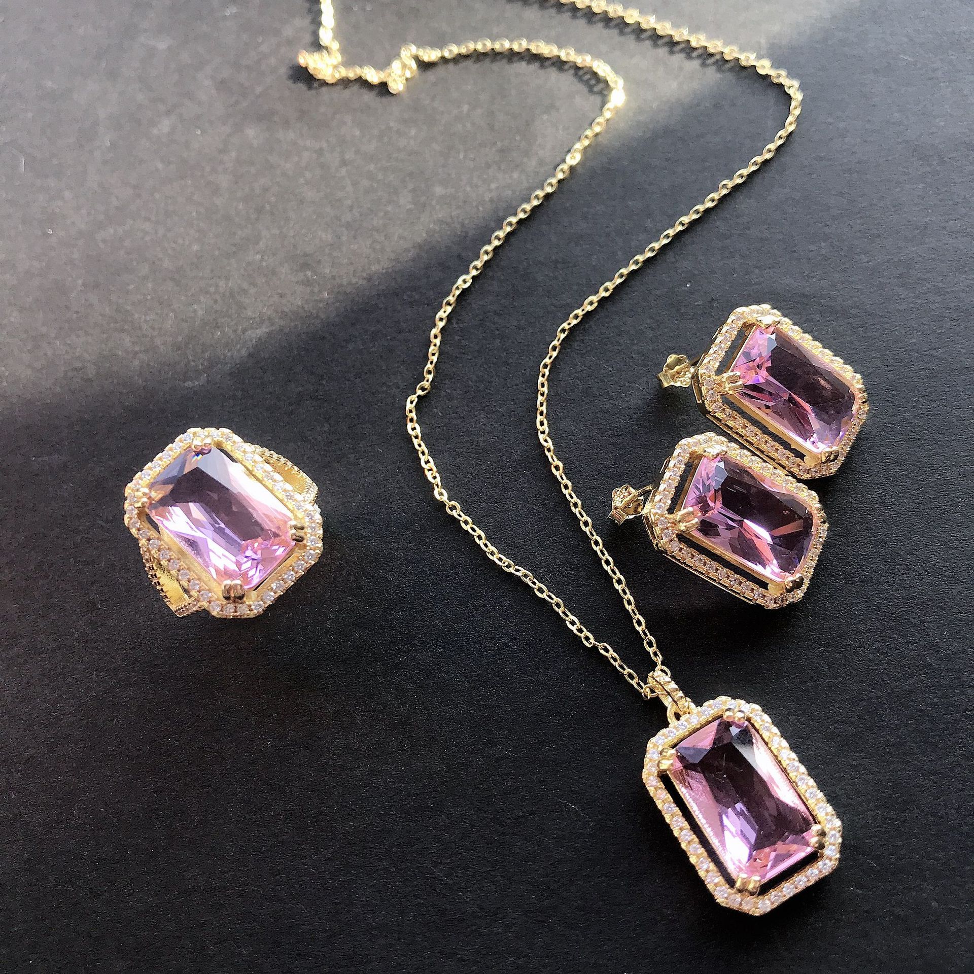 Color: JZ629 pink ring gold-plated [opening], DZ234 pink pendant gold-plated [without chain], RS374 pink earrings gold-plated, pink gold-plated three-piece set [without chain]]