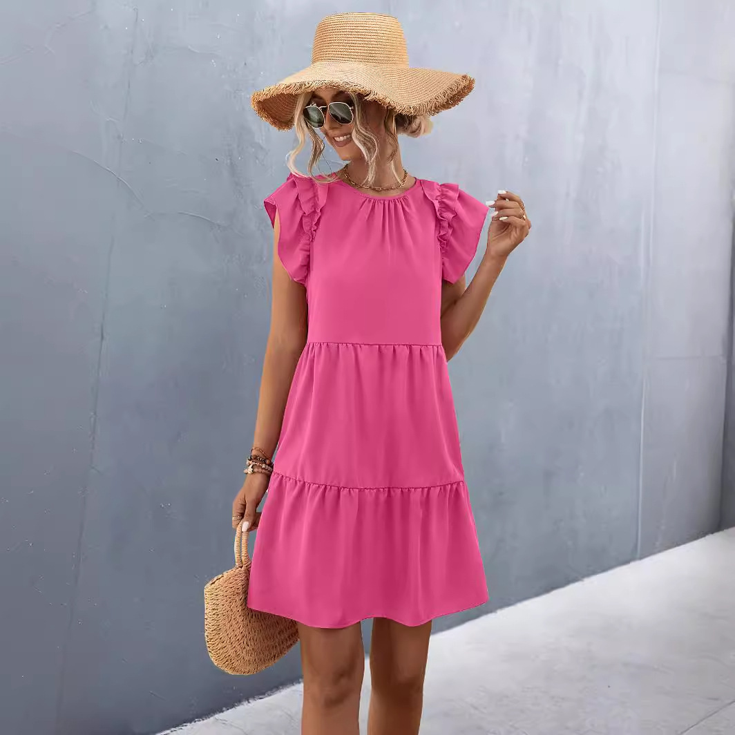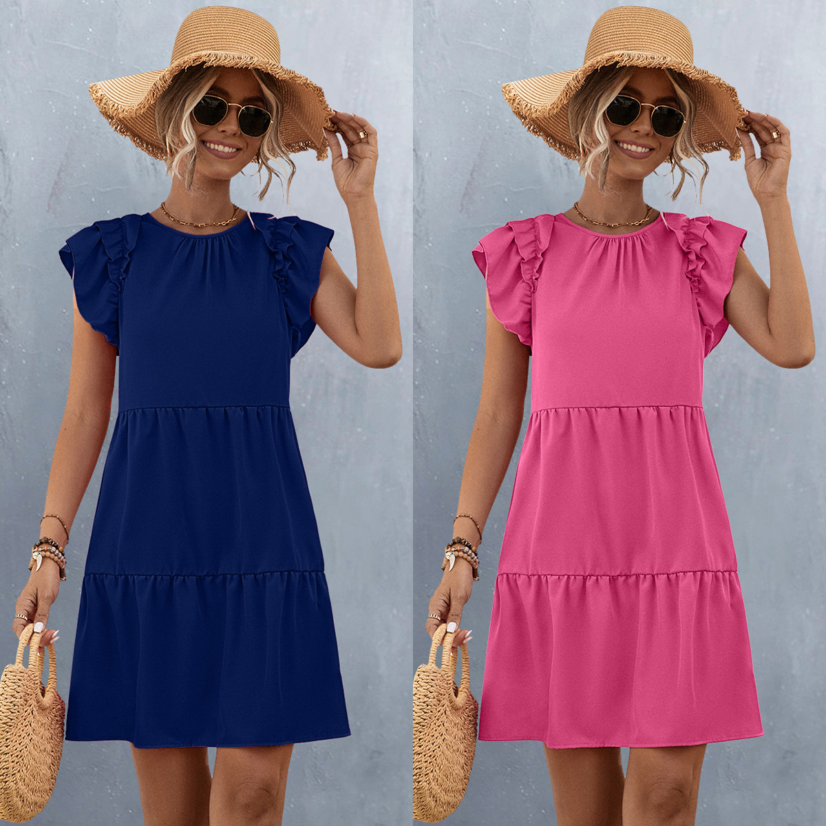 Product information: Color: pink, blue Sleeve type: ruffle sleeve Main composite material: Polyester (polyester fiber) Size: S,M,L,XL Long Sleeve: short sleeve Skirt classification: Dress