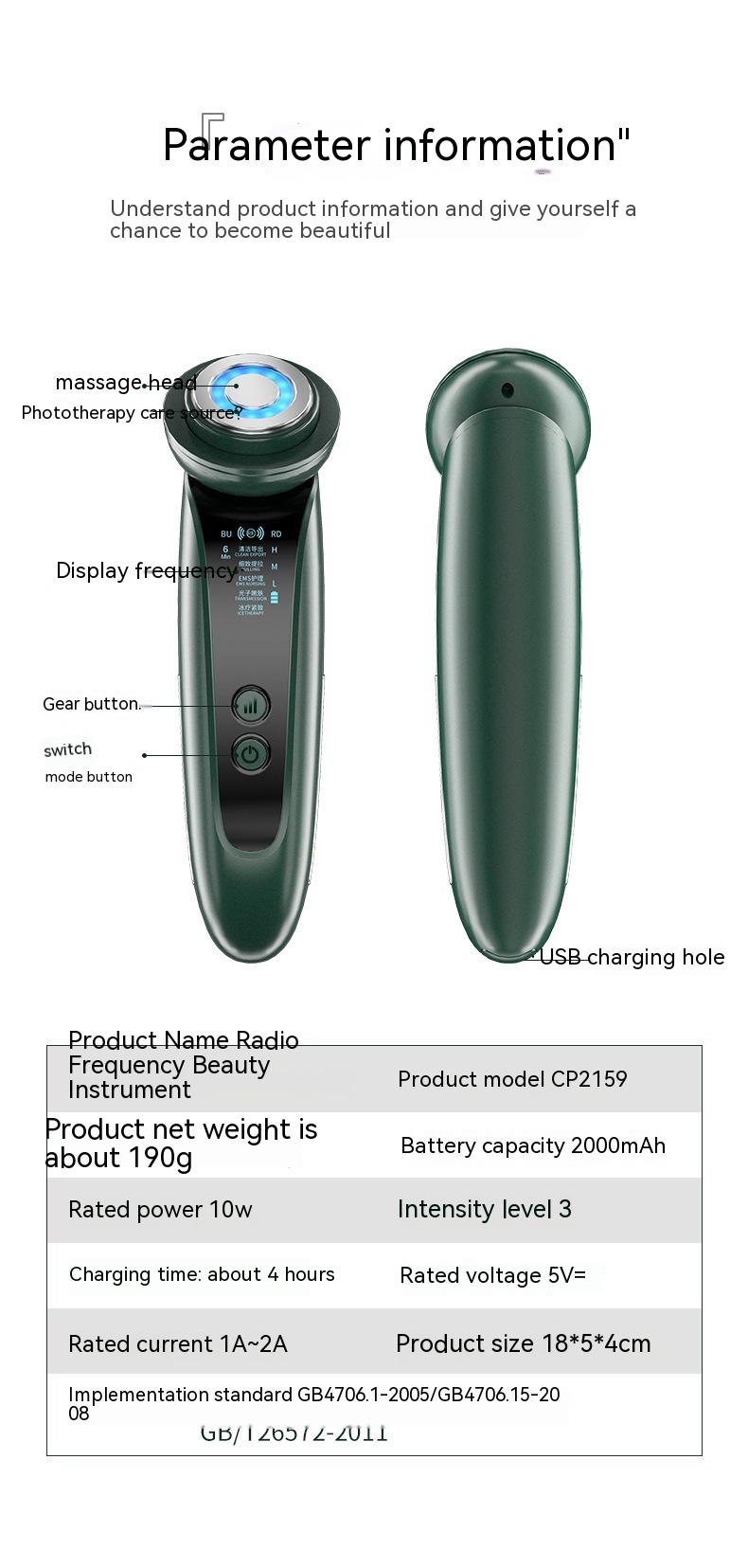 Battery capacity: 2000mAhStrength gear: 3rd gearRated voltage: 5V---Product size: 18 * 5 * 4cmRated power: 10WCharging time: approximately 4 hoursRated current: 1A~2A