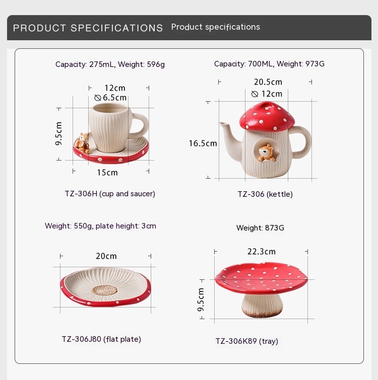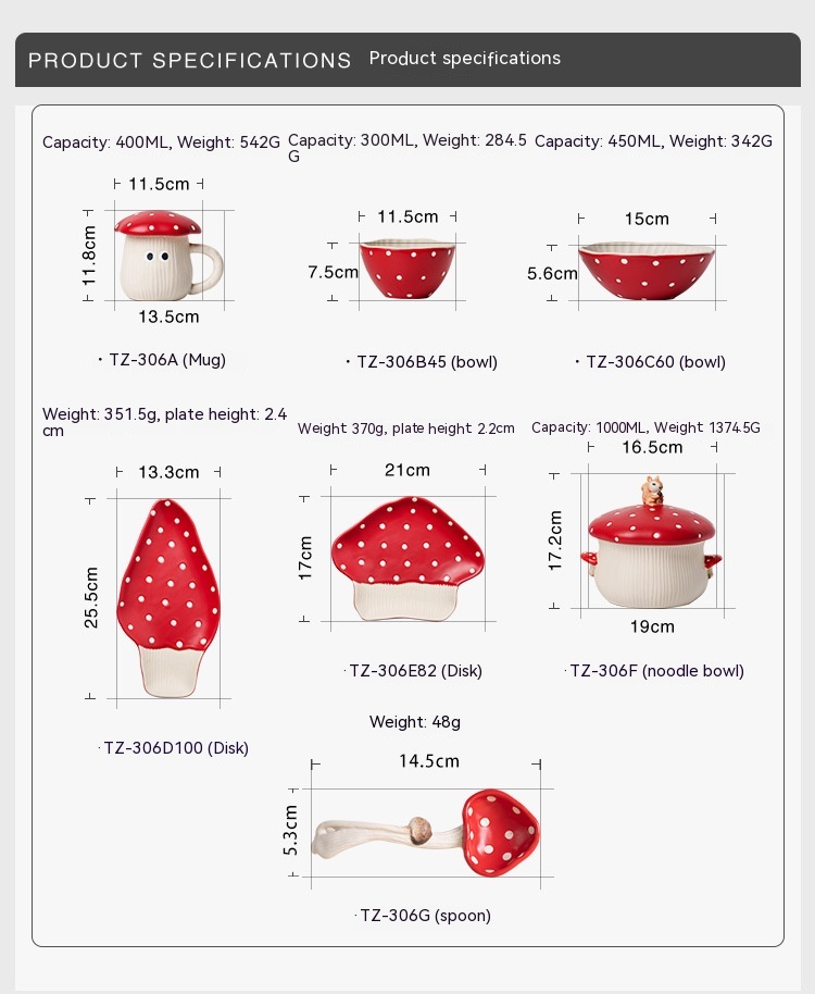 Color: TZ-306G mushroom-spoon, TZ-306 mushroom-mug, TZ-306 mushroom-4.5 inch small bowl, TZ-306 mushroom-6 inch large bowl, TZ-306 mushroom-10 inch long platter, TZ-306 mushroom-8 inch modeling plate, TZ-306 mushroom-8-inch disc, TZ-306 mushroom-cup and plate set