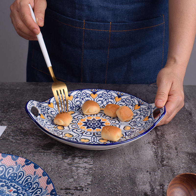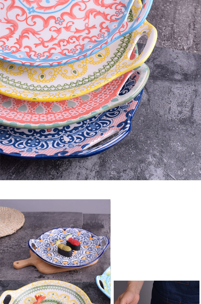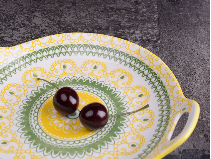 Color: green pattern yellow flower [round], light blue green leaves [round], green vine yellow [round], dark blue torch [round], weaving red fire dance [round], brick red water droplets [round]
