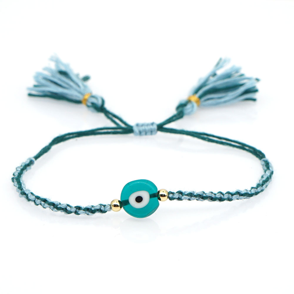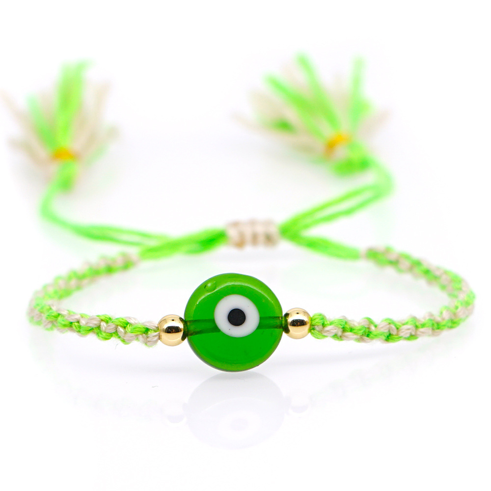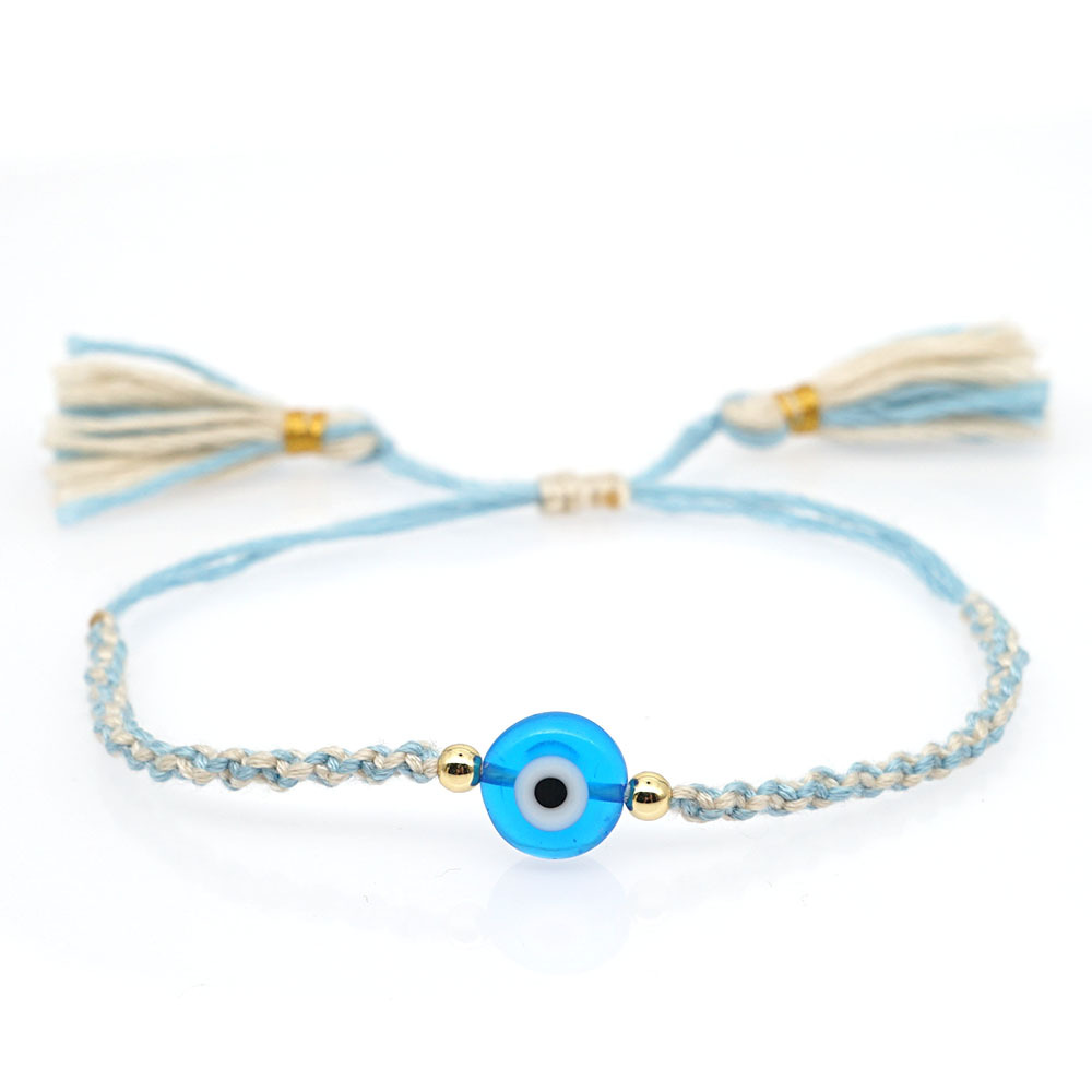 Material: Glass Eye Bead + Gold Plated acrylic beadPerimeter size about 28cm (adjustable)Rope material: embroidery thread (ecological cotton thread)Craft production: pure hand knitting