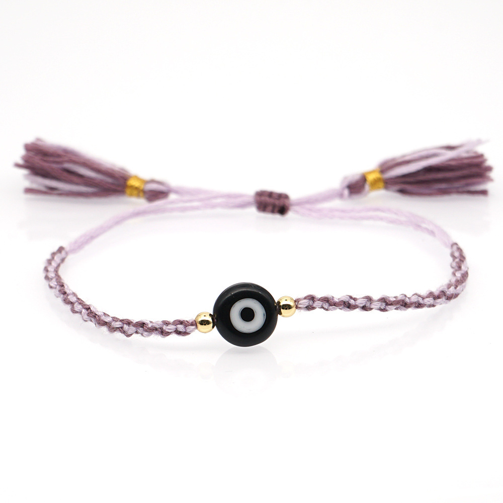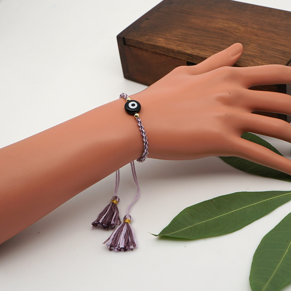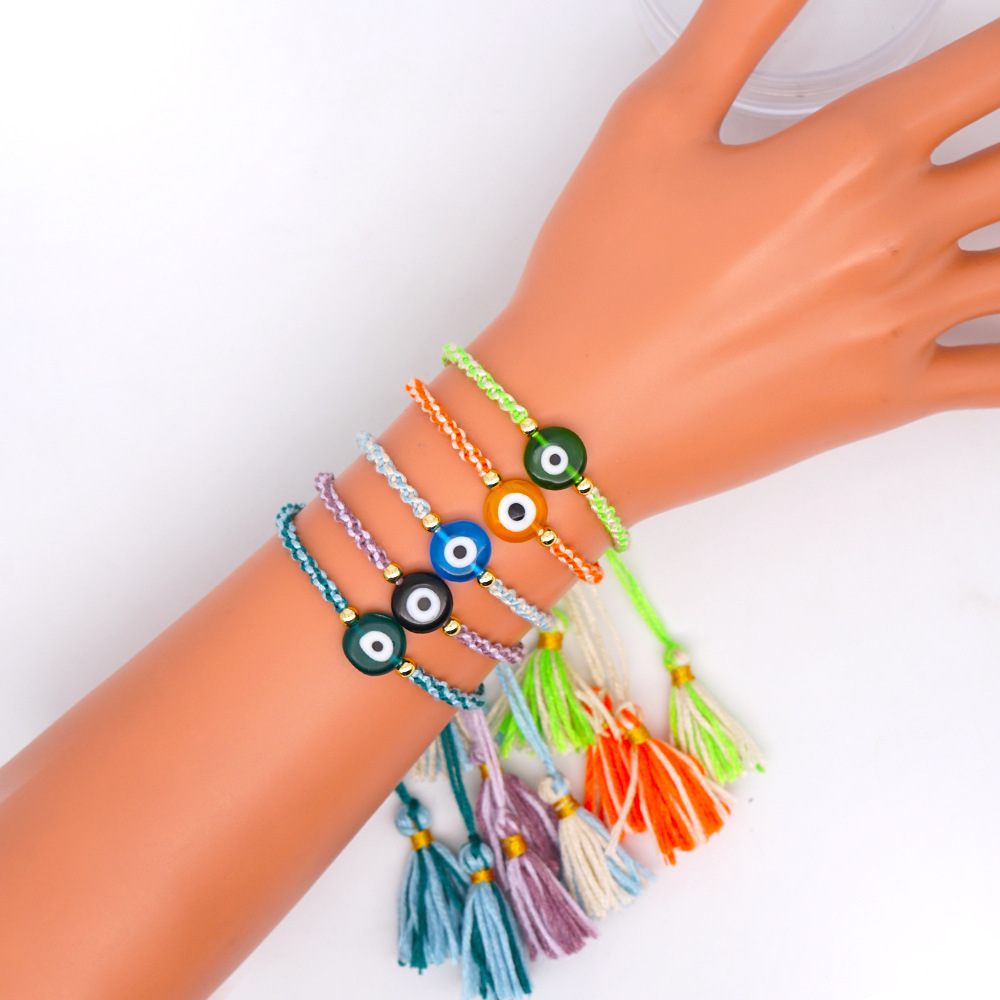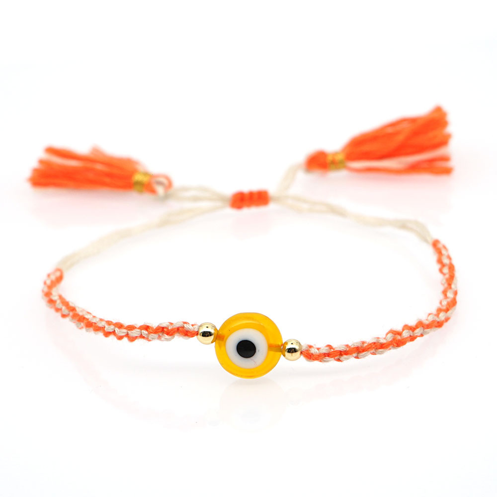 Material: Glass Eye Bead + Gold Plated acrylic beadPerimeter size about 28cm (adjustable)Rope material: embroidery thread (ecological cotton thread)Craft production: pure hand knitting