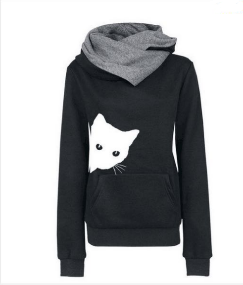 Ms. Cat Print Pocket Hooded Long Sleeve Fleece Sweater 4 Color Spot S-3XL