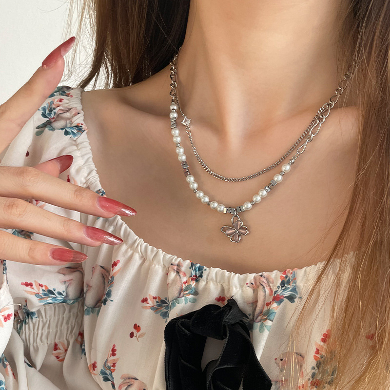 Product information:Color: pink butterfly pearl necklaceApplicable people: womenPendant material: AlloyChain style: twisted piece chainMaterial: titanium steelModeling: InsectPopular elements: ButterflyStyle: sweet and cool