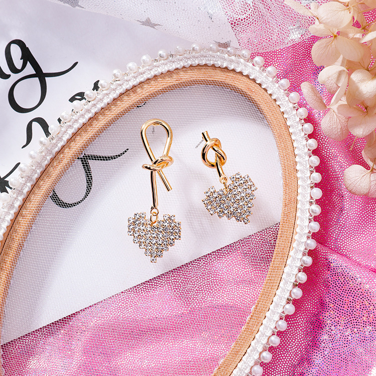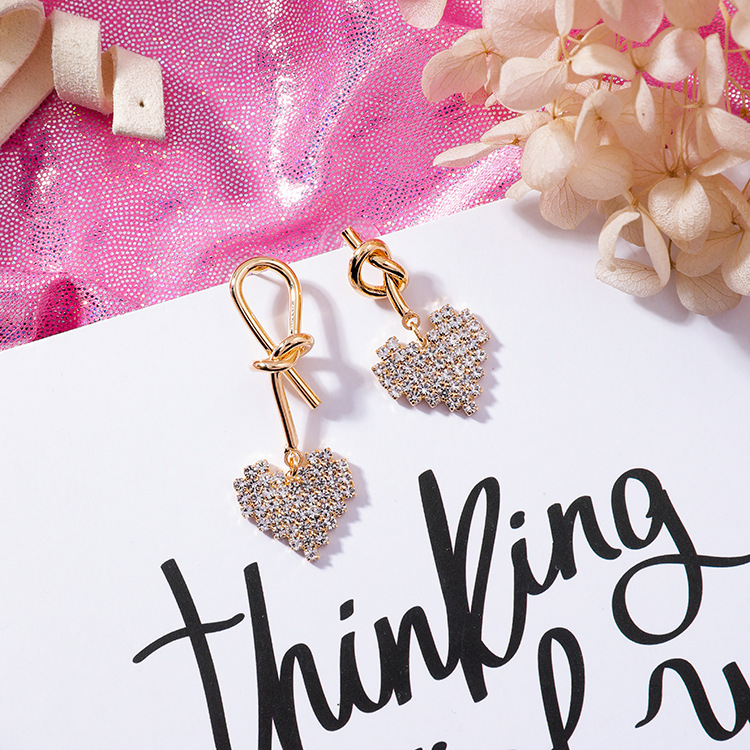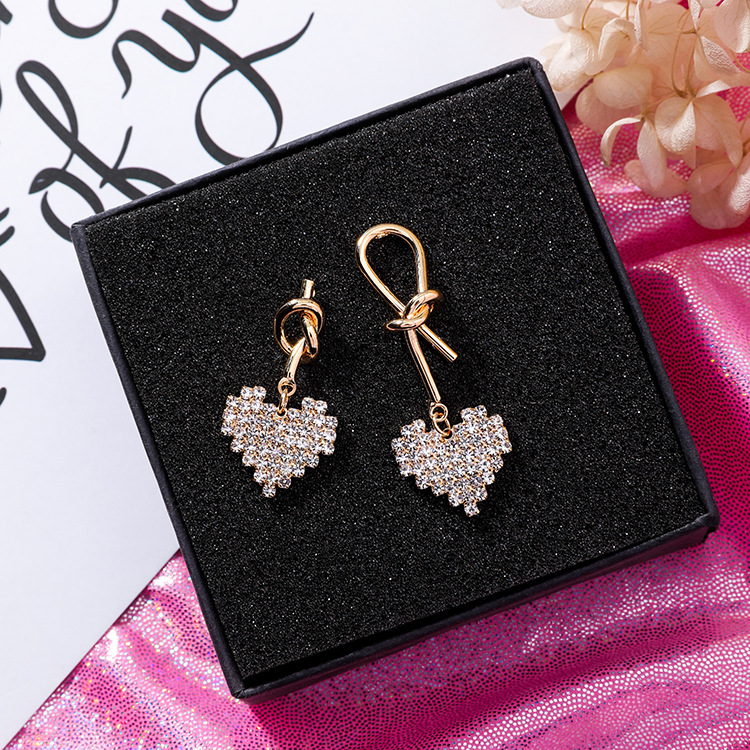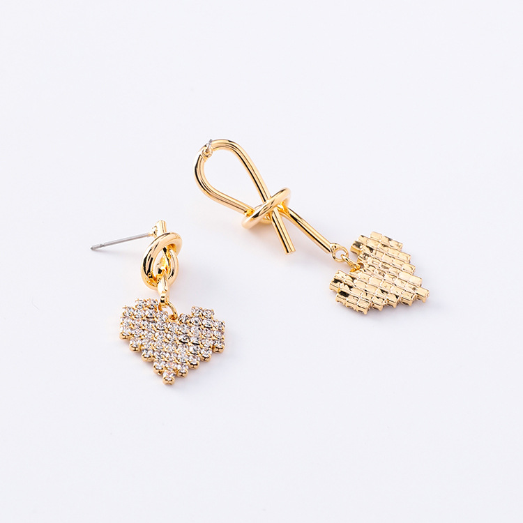 Full diamond love knot knot stitching earrings cute asymmetrical heart earrings