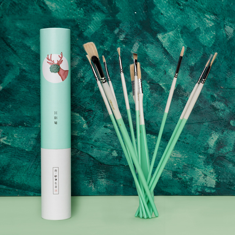 1 wide brush, 1 nylon gouache, 1 eyeliner brush, 1 chalk, 1 corner brush, 4 fan-shaped brushes.