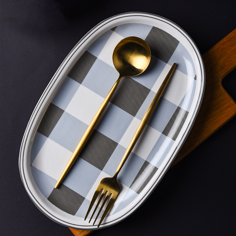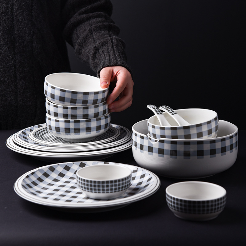 Colour: 5 inch-gray grid rice bowl gray grid-small dish gray grid-small spoon 28CM- gray grid oval plate 6 inches- gray grid noodle bowl 7 inches- gray grid soup bowl 10 inches- gray grid disc gray grid-large Soup spoon 7 inches-gray grid disc 9 inches-gray grid disc