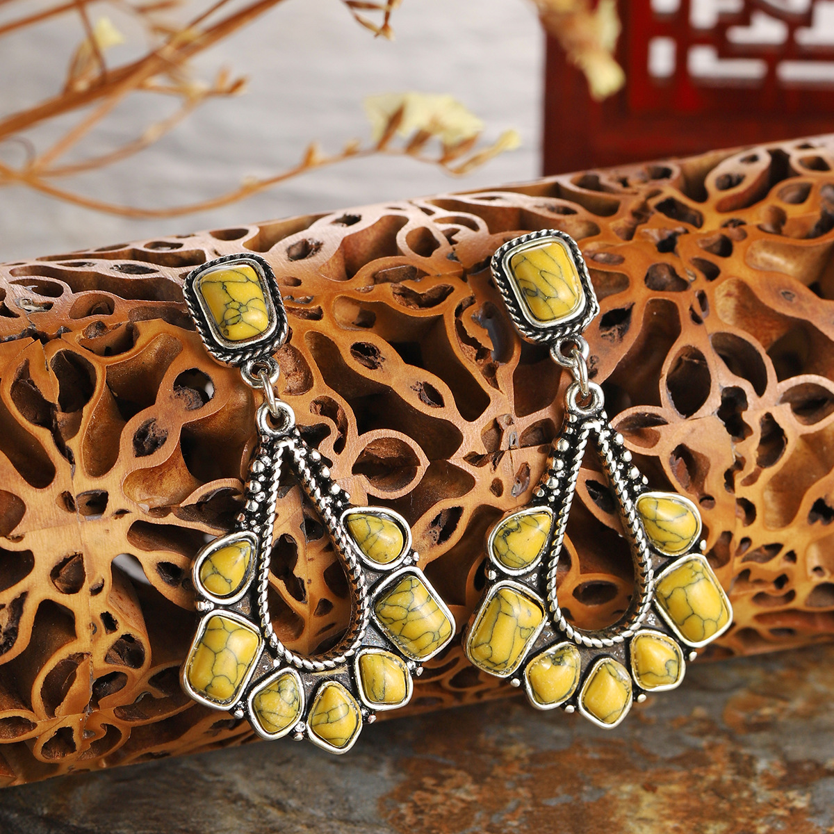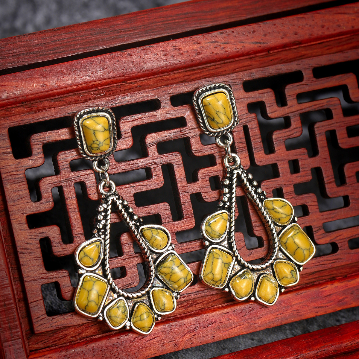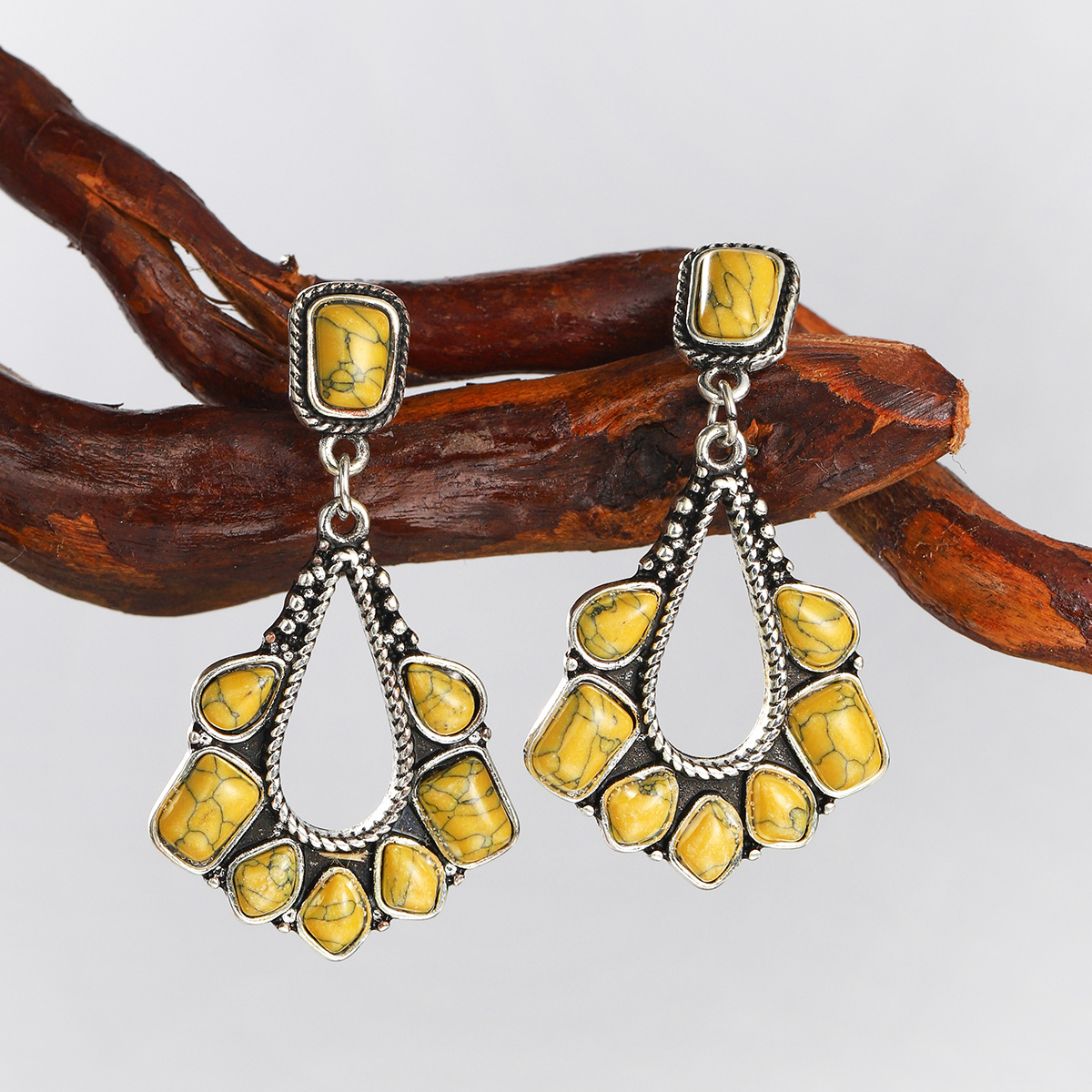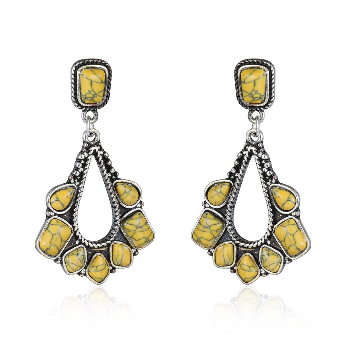 Product name: earringsProduct electroplating: ancient silver platingProduct material: alloy + turquoiseMosaic color: green, white, yellowProduct weight: about 8g (subject to actual weight)Product packaging: 1 pair into the bag