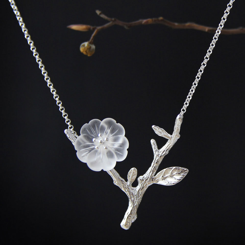 Sterling silver crystal flower necklace, hand-carved, beautiful, artistic, female silver