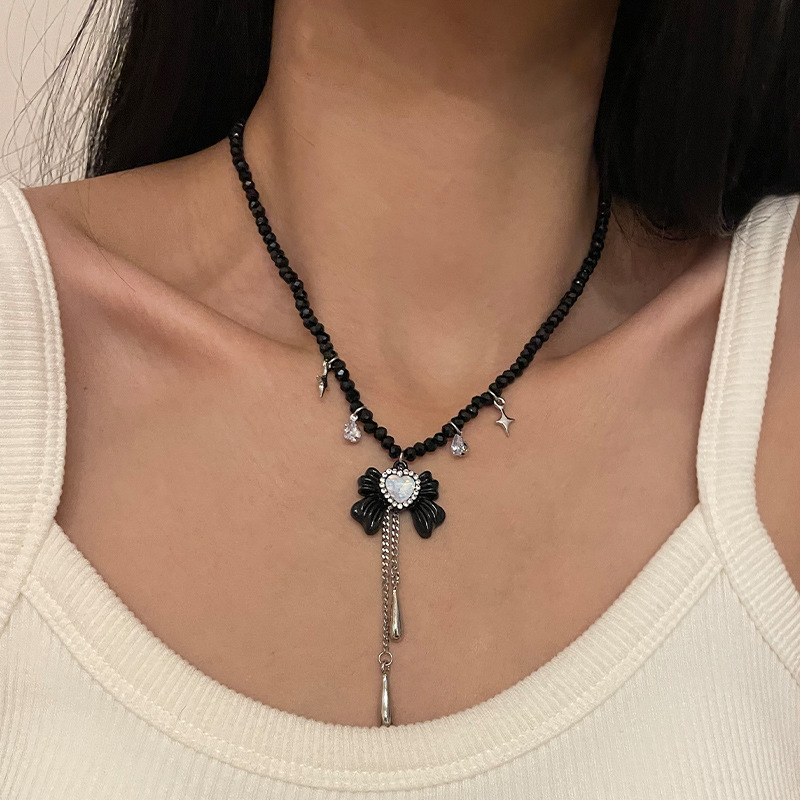 Product information:Color: Bow necklace with fringe heartSuitable for: WomenPendant material: alloyChain style: clavicle chainMaterial: Beads/beadsShape: Heart, bow, drop shapePopular elements: Bows, tassels, hearts/heartsStyle: Sweet cool