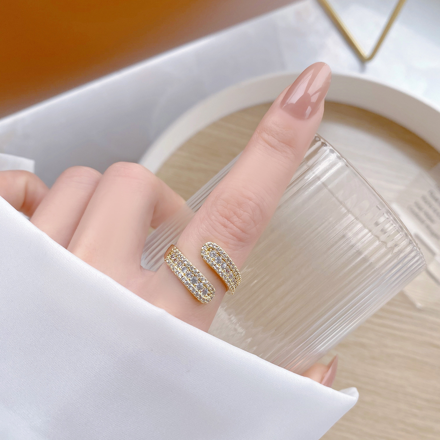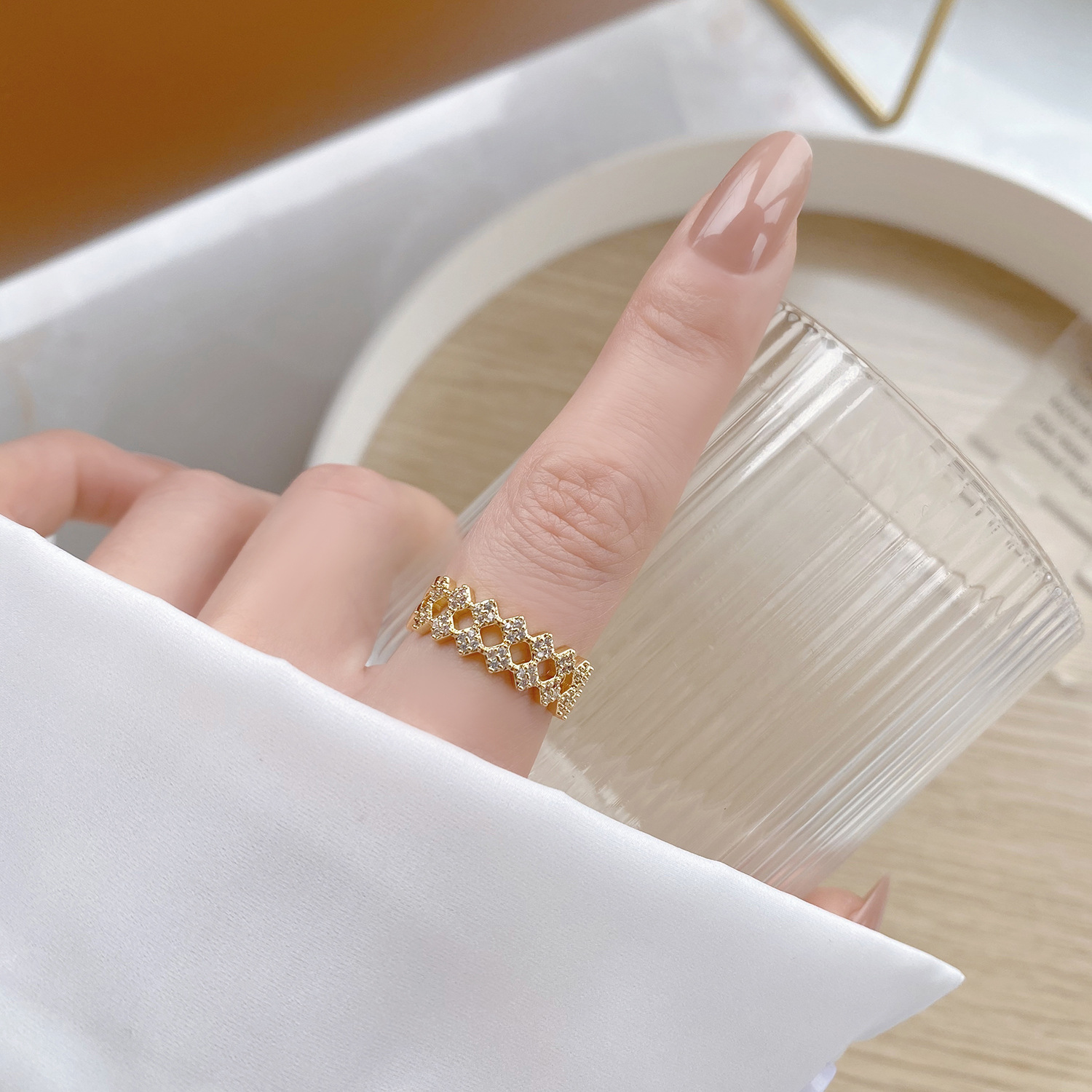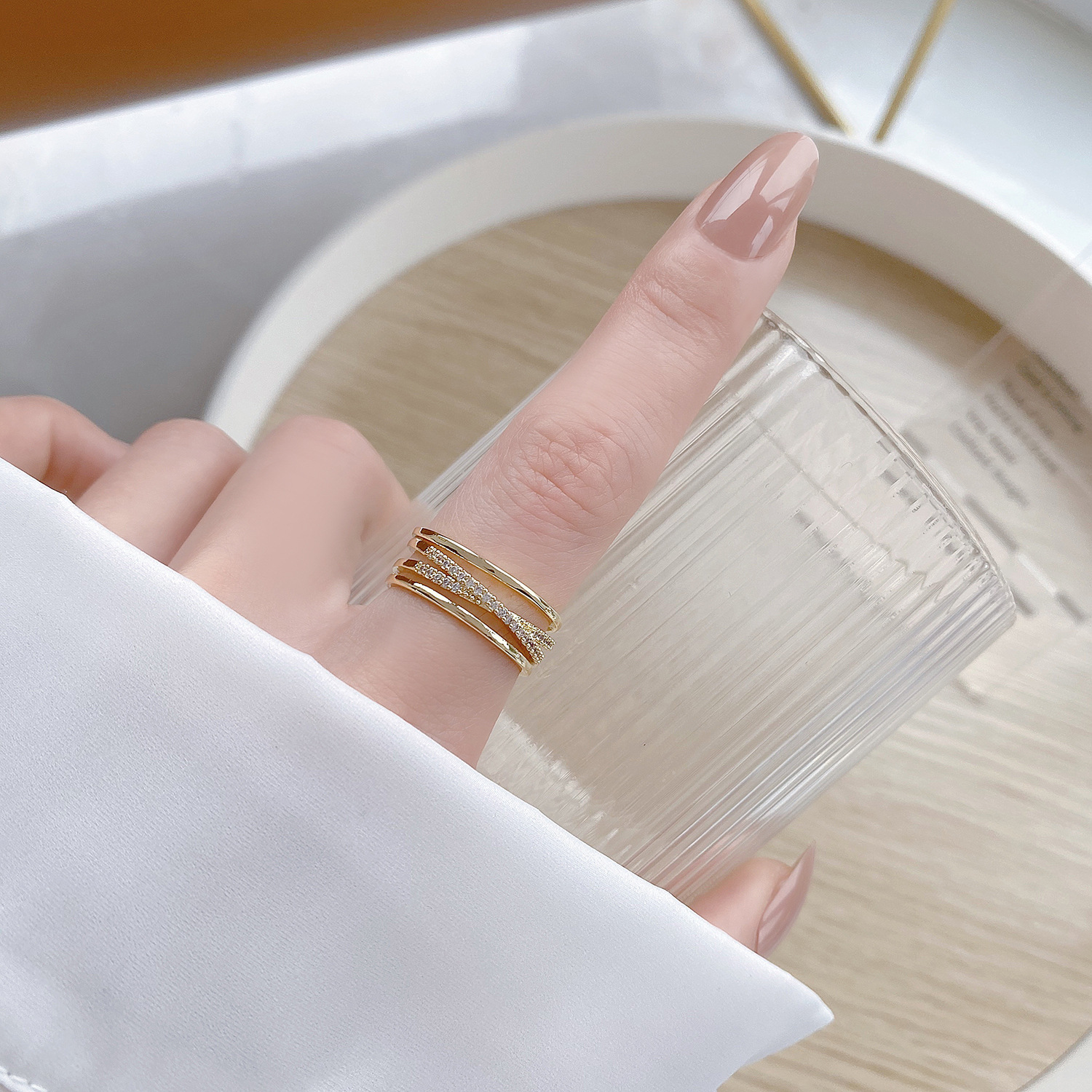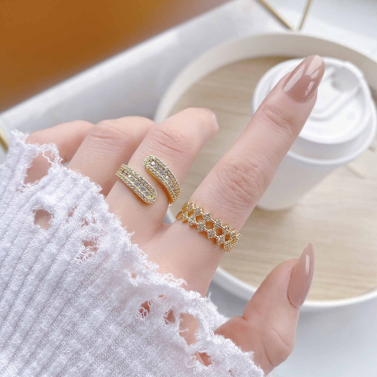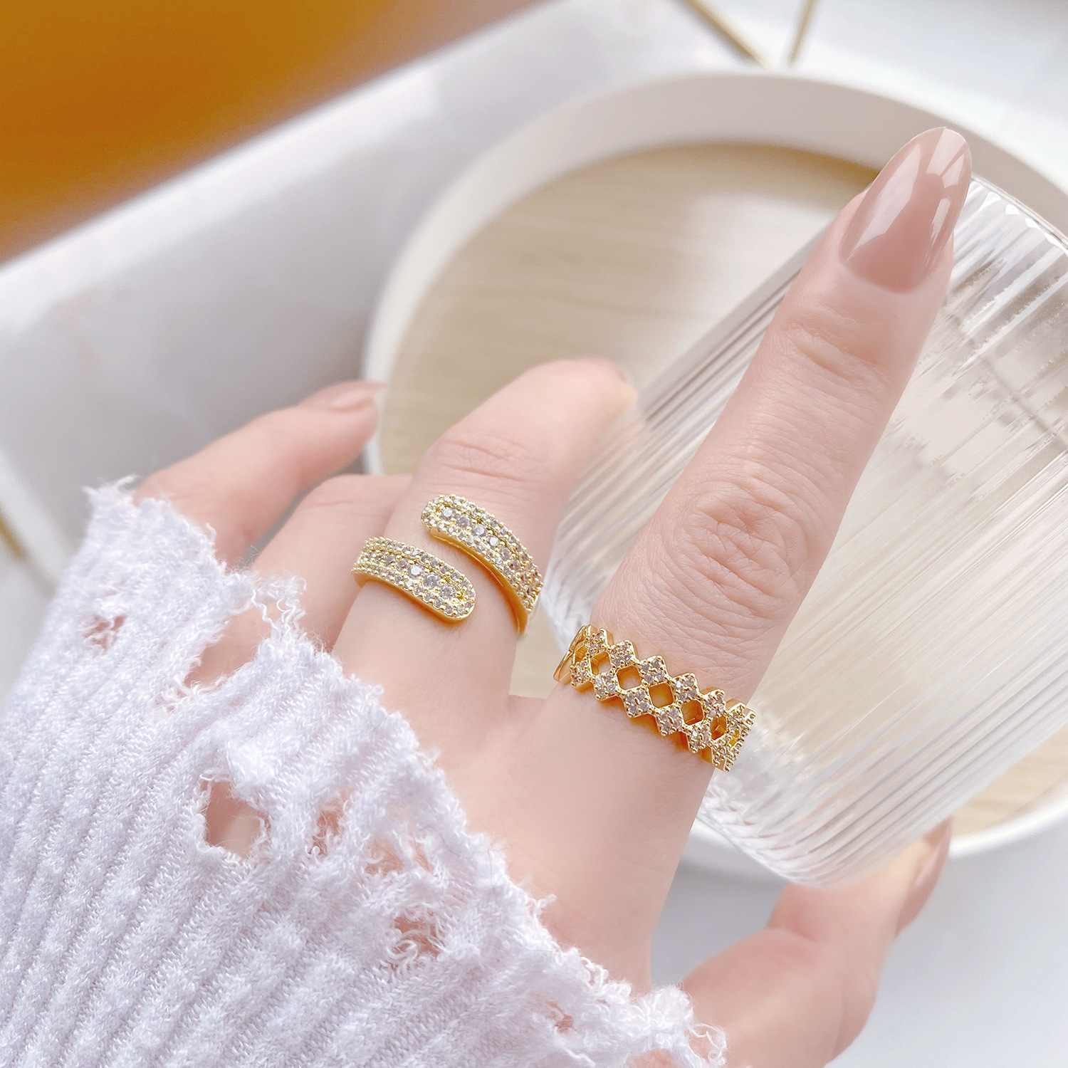 Color Diamond double-layer open ring, offset zircon open ring, 4-layer cross zircon open ring