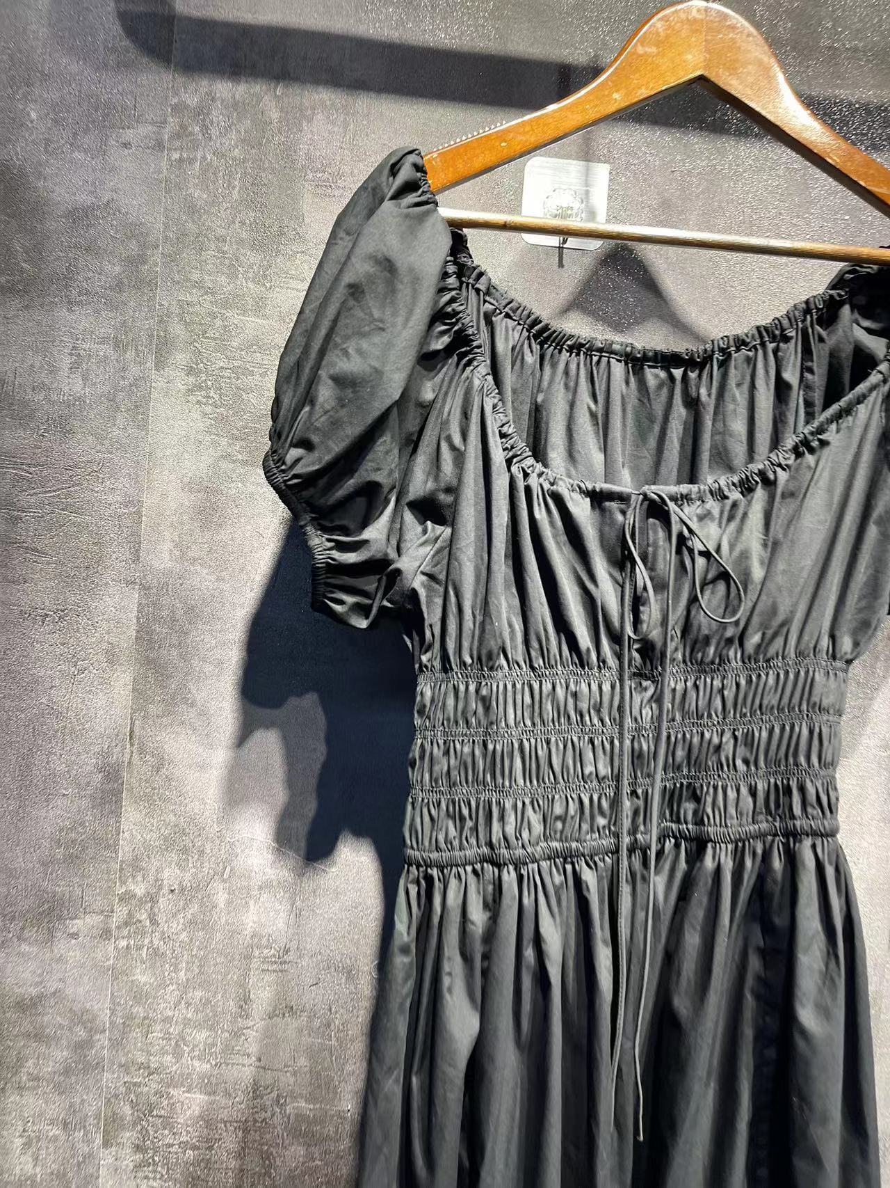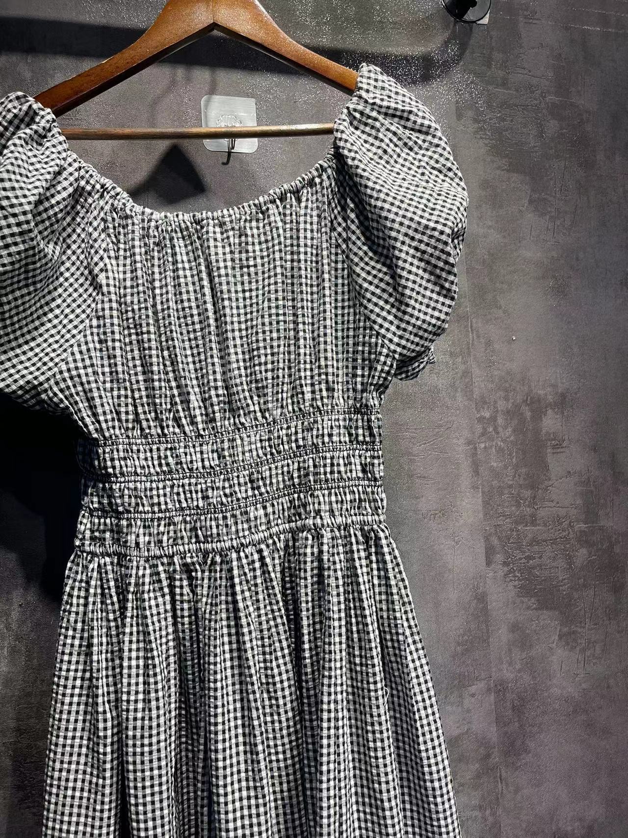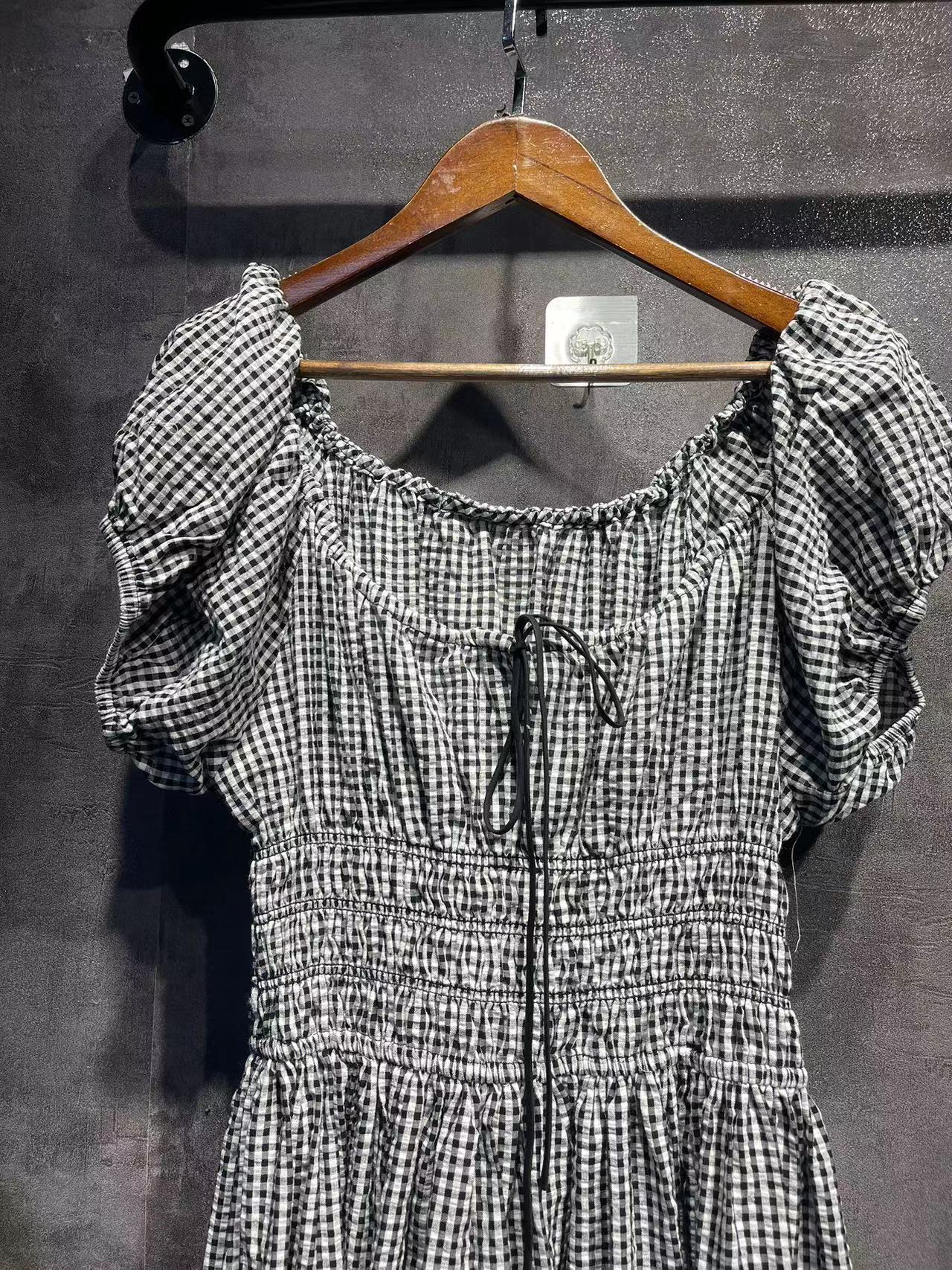 Women's Black Plaid Cotton Puff Sleeve Waist-controlled Large Hem Lace-up Dress