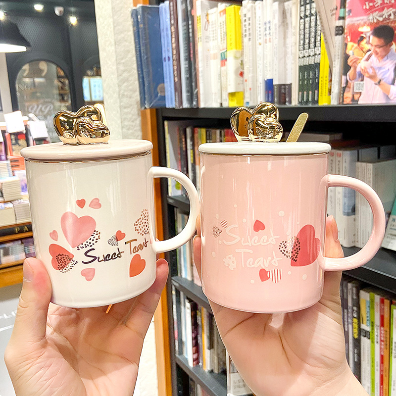 Color: pink cup with a circle of peaches, white cup with white letters, pink cup with half peach heart, white cup with gold letters