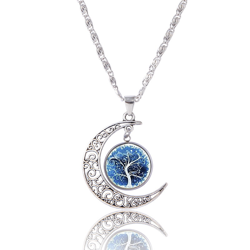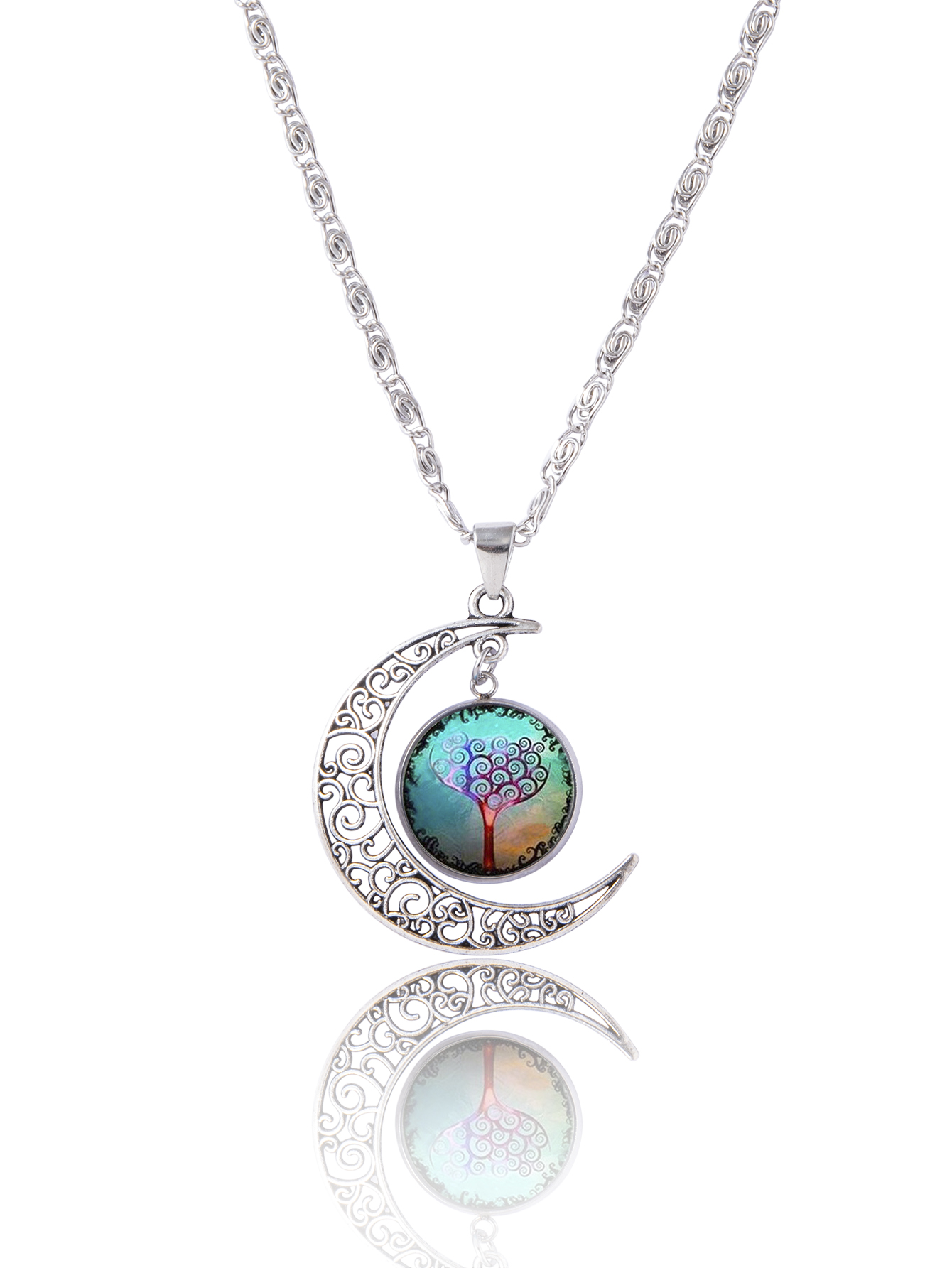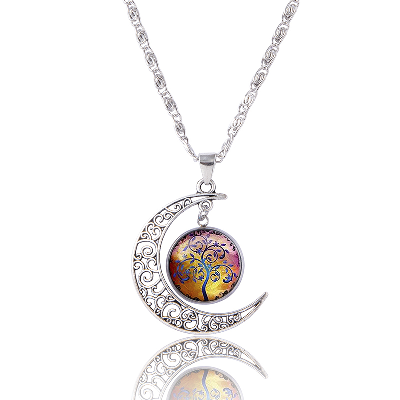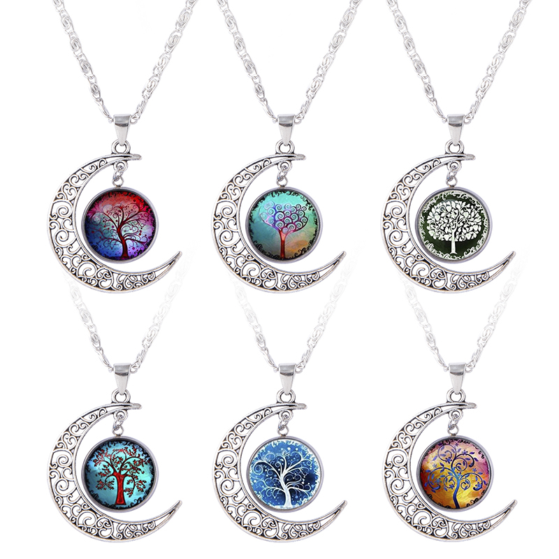 Colorful Tree Of Life Glass Necklace For Women Girls Vintage Hollow Moon Pendant Necklace Birthday Jewelry