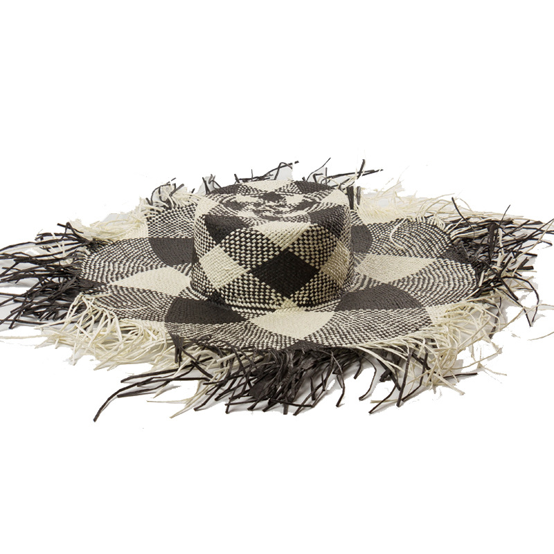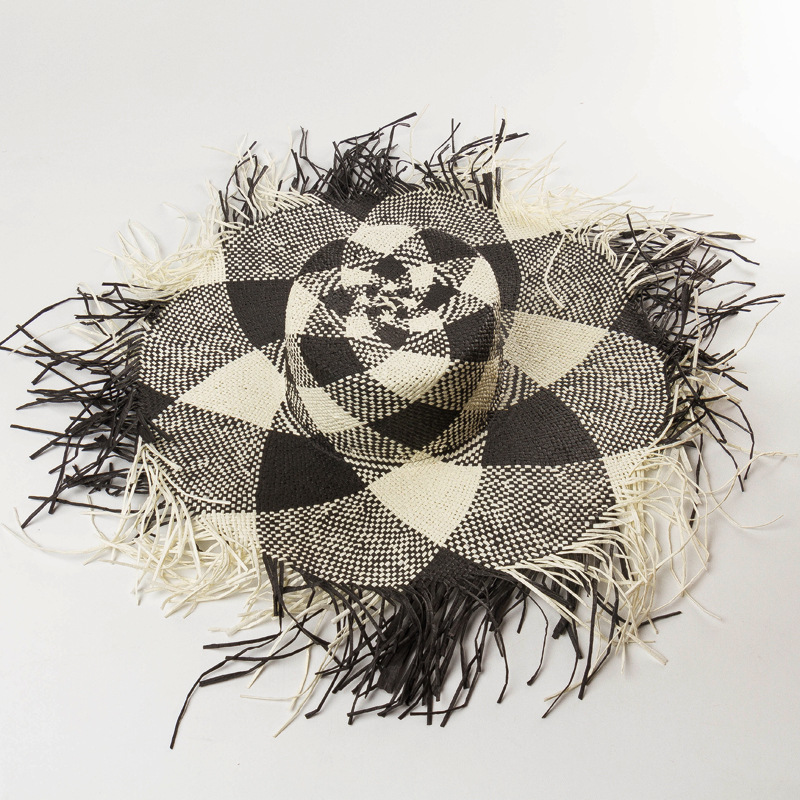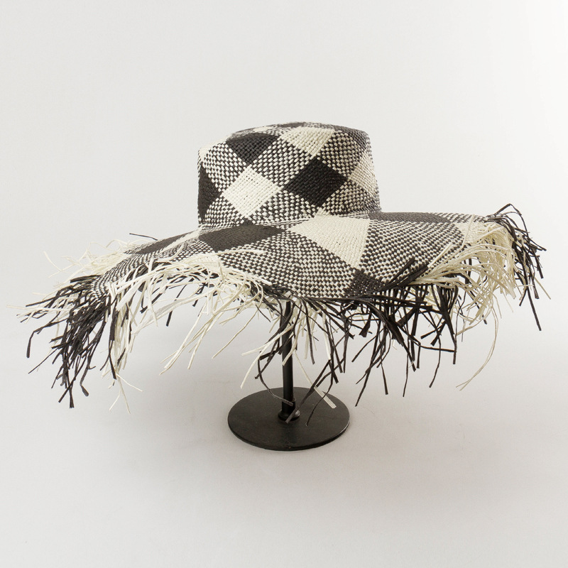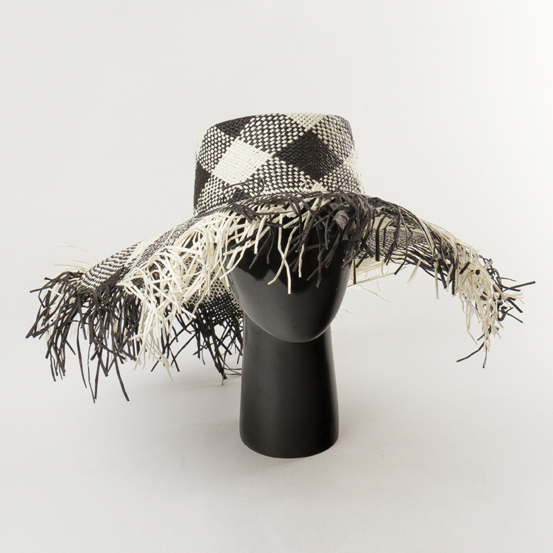 Product Name: spring and summer new grey black and white geometric color matching flat top fur fringed Big Brim Straw HatMaterial: PapyrusSize: 57cm adjustable sweat bandCap height: about 10cmBrim: About 13cm + 3cm