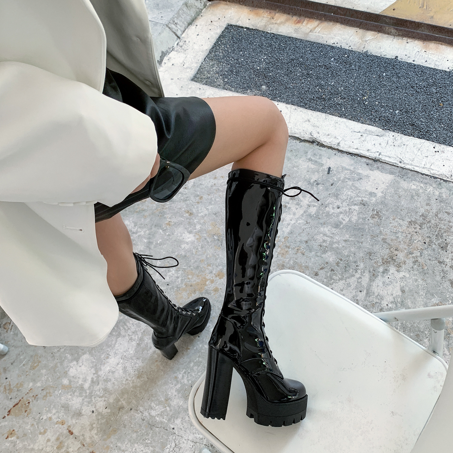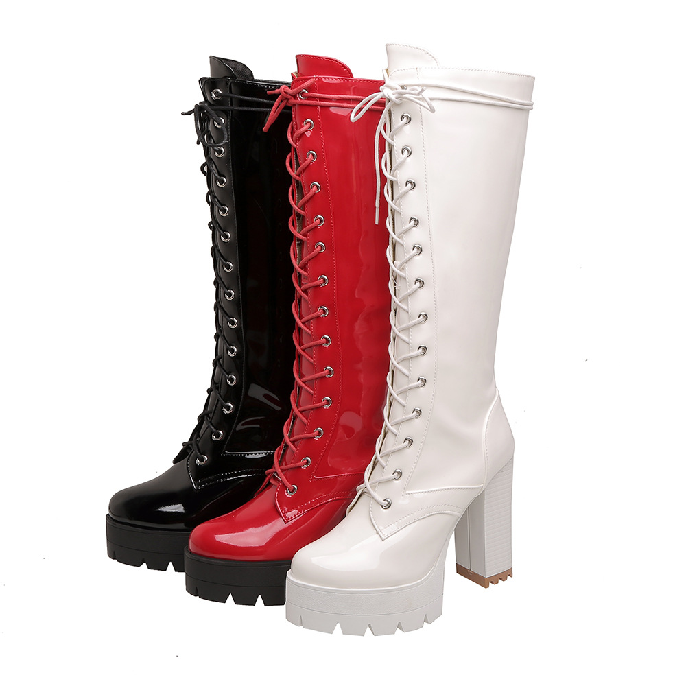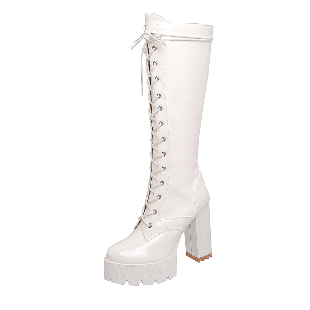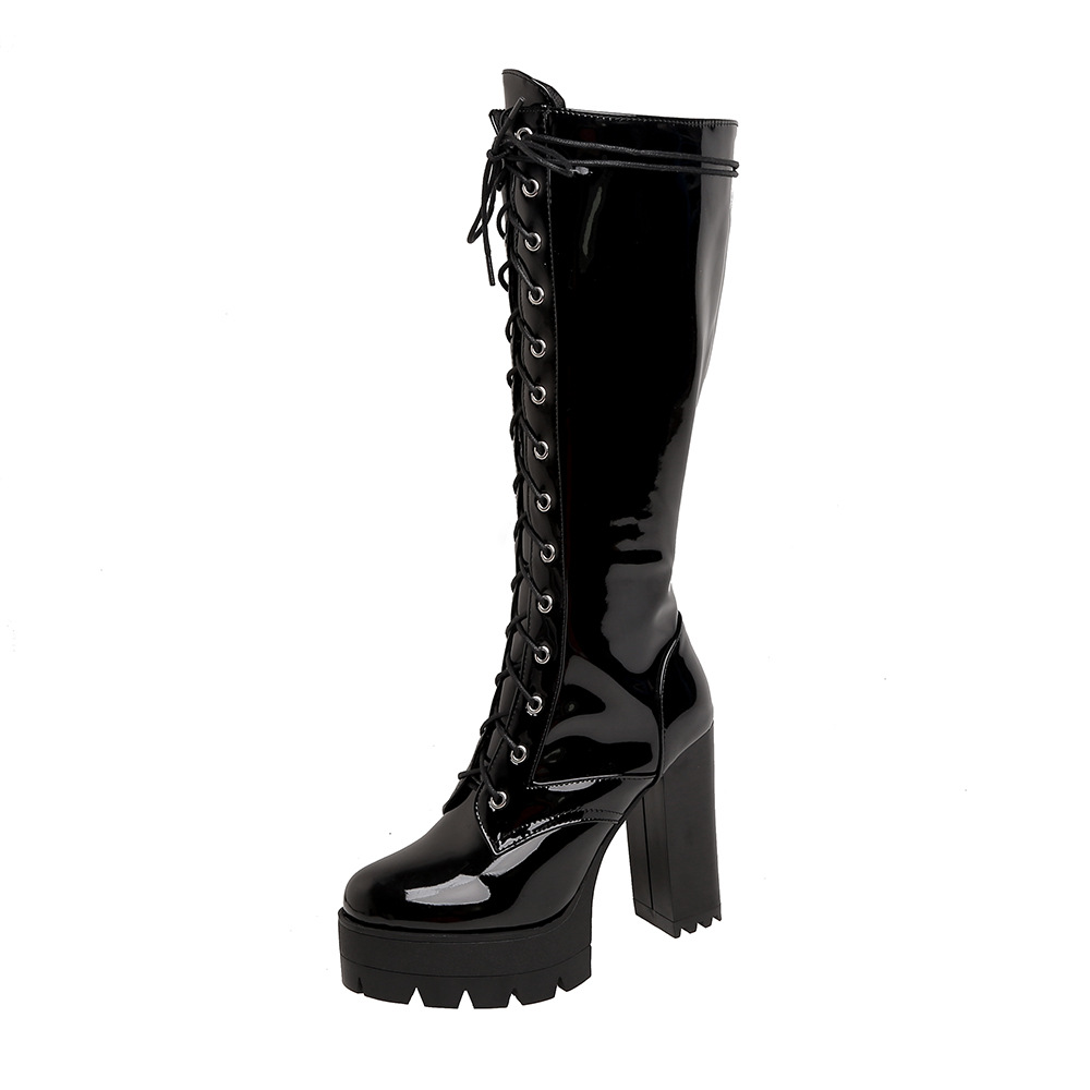 Sole: rubber soleUpper Material: Artificial PUApplicable gender: femaleToe shape: round headHeel shape: thick heelPopular boots: fashion bootsPopular element: waterproof platformTube height: high tube