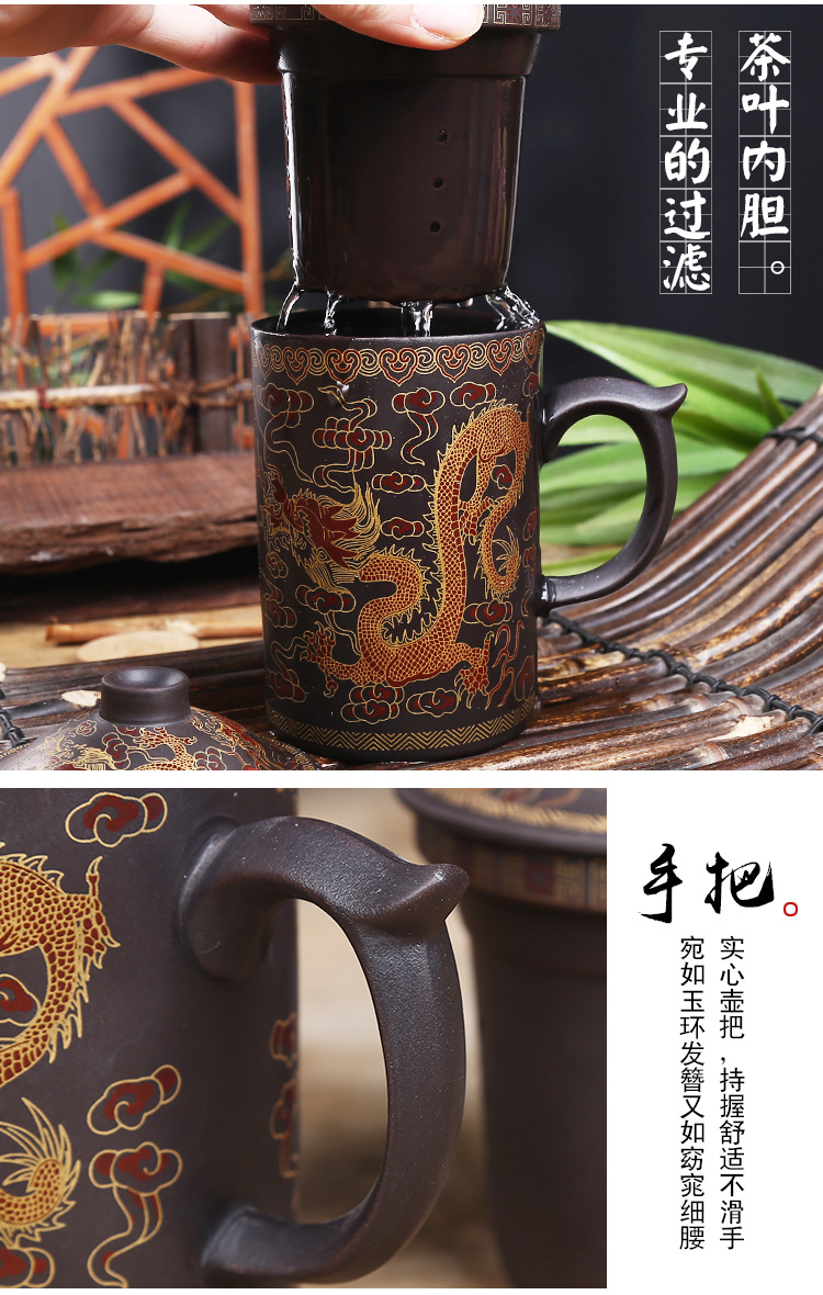 Color classification:, a pair of black dragon and phoenix tea cups (with strainer), Xianglong Tea Cup pair (one black and one red with filter disc), Red Dragon and Phoenix Tea Cup pair (with filter disc)