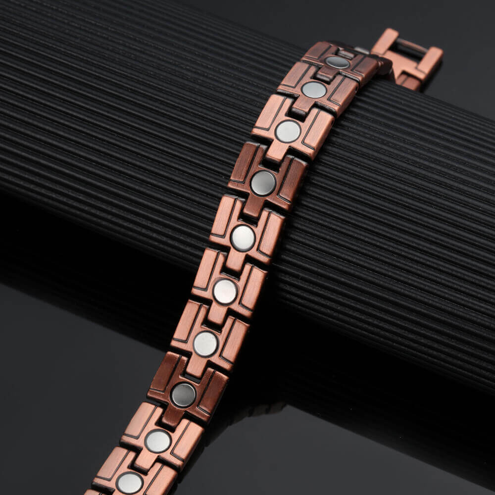 Product features: 99.95% red copper material, inlaid with strong magnets.Style: Europe and AmericaMaterial: red copperType: BraceletStyle: UnisexModeling: geometricInlay material: not inlayColor: bronze