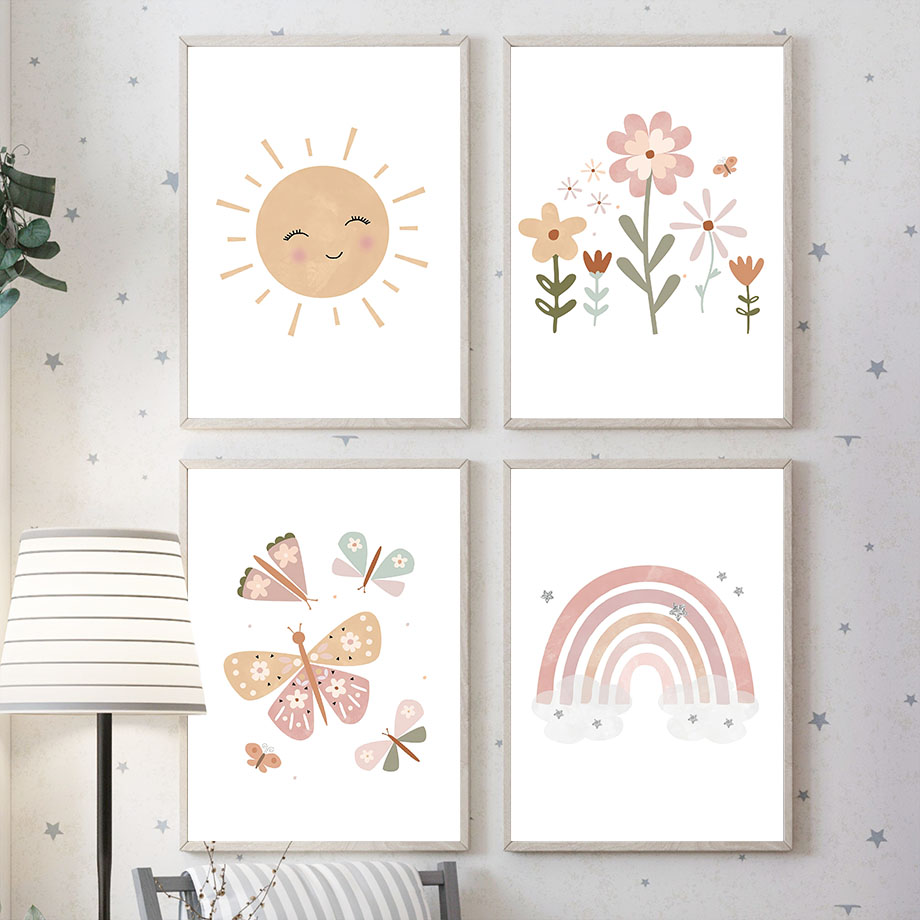 Sun Cloud Rainbow Flower Butterfly Fruit Quote Wall Art Canvas Painting Scandinavian Poster