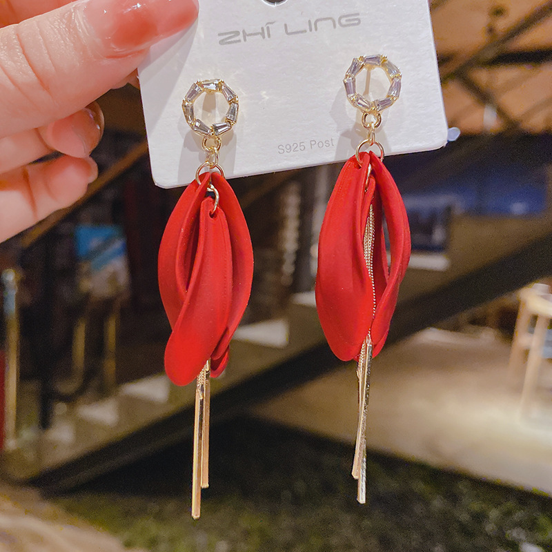 925 Silver Needle Red Copper Earrings Studded With Zircon Women's Long Tassel Earrings New Trendy Korean Online Influencer Earrings