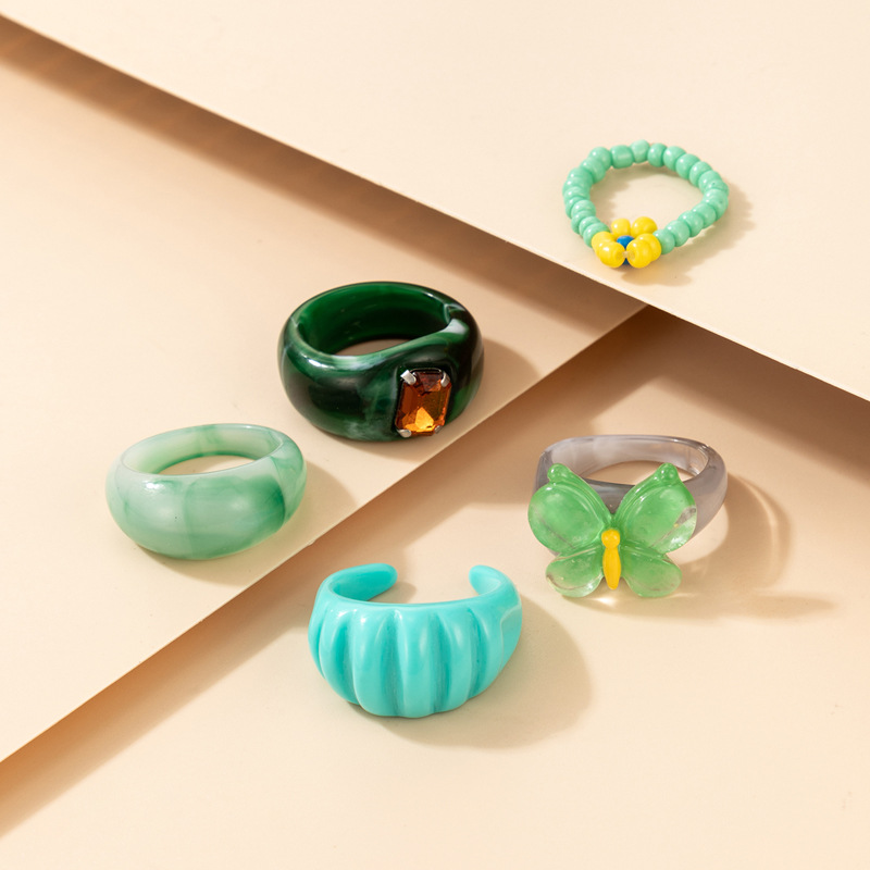 Rice Beads Flower Ring With Diamonds And Acrylic Butterfly Resin Ring 5-piece Set