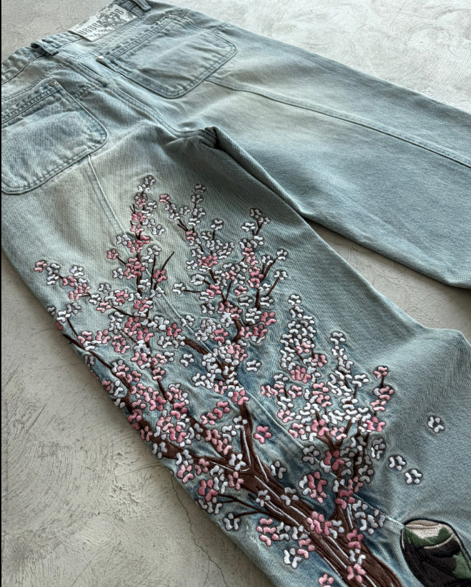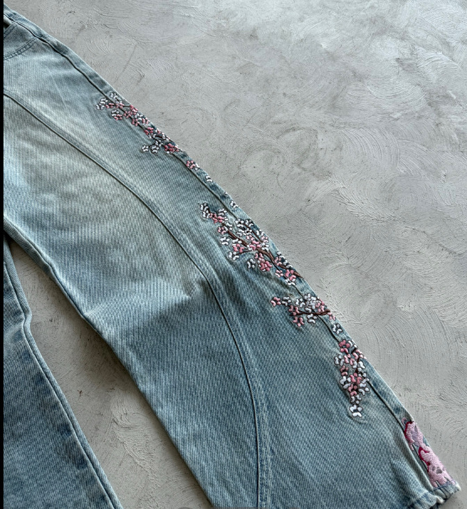 Product information:Color: blue Pants length: trousers Waist Type: Mid waist Size: S,M,L,XL,XXL Main fabric composition: Cotton Pants type: Straight Craft: Embroidery