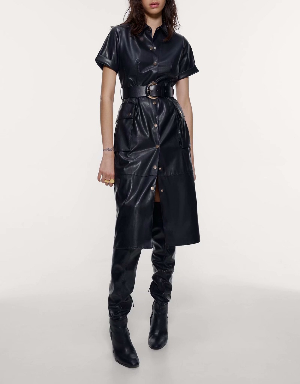 Autumn street hipster women collage linen short sleeve lapel A-line skirt dress