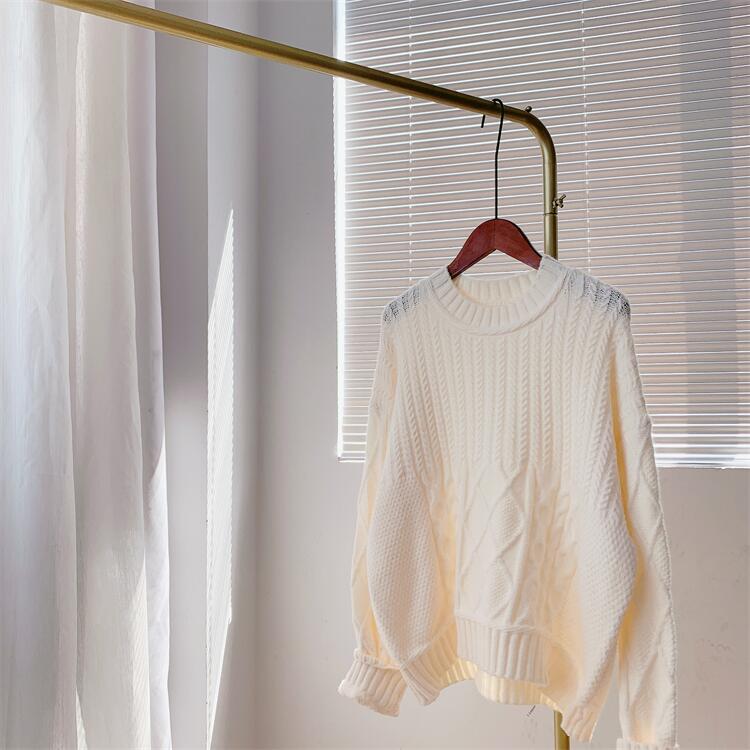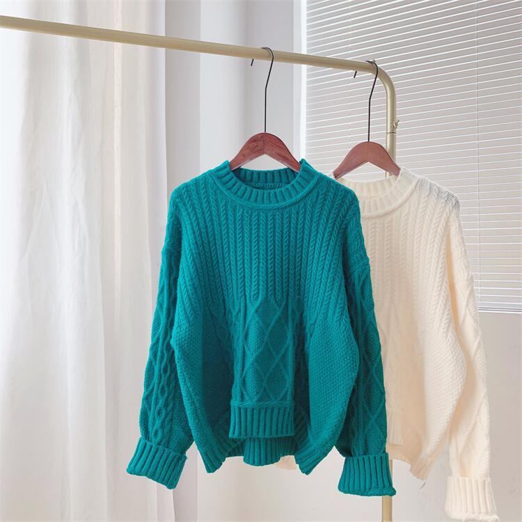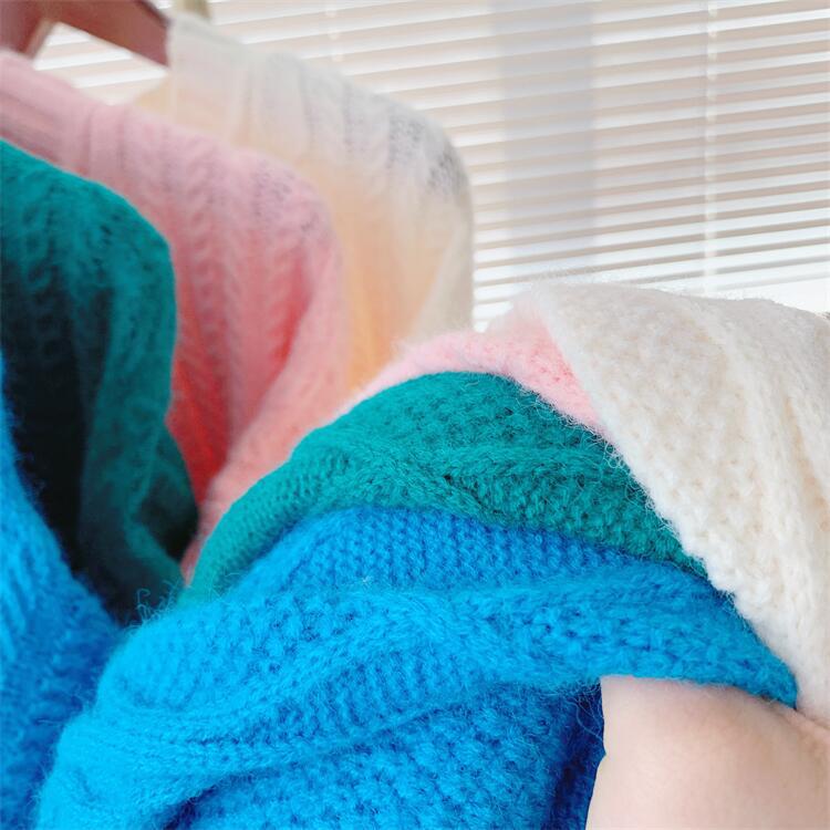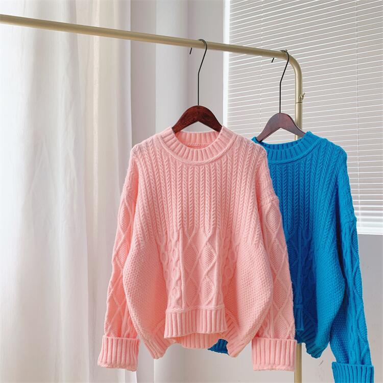 Color: royal blue twist base sweater, lake green twist base sweater, cream white twist base sweater, light pink twist base sweater