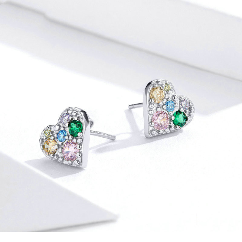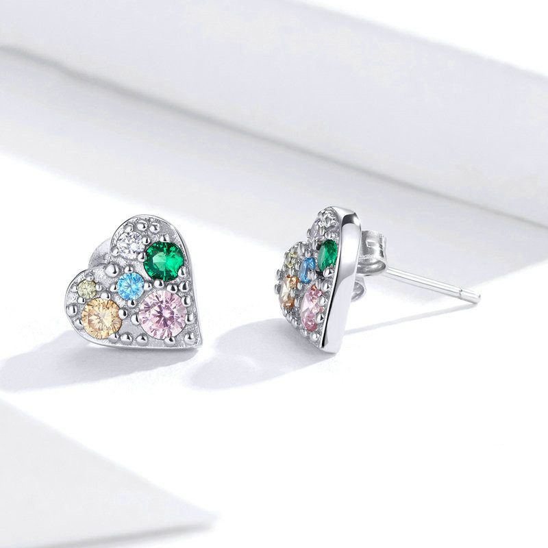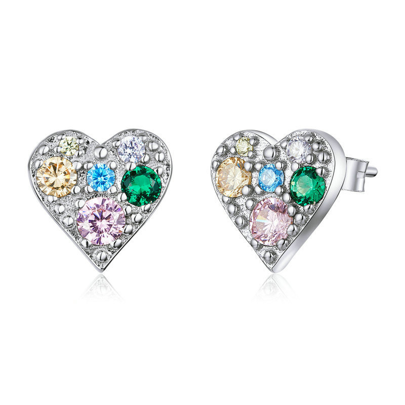 Sterling Silver Stud Earrings Colored Zircon Heart Shaped Personality Earrings