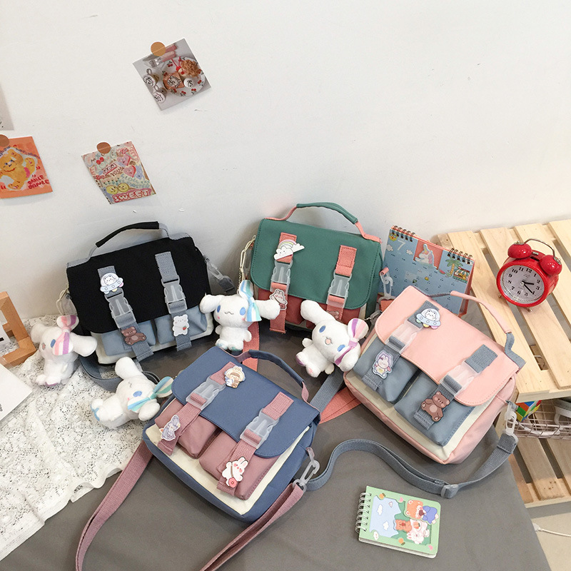 Specifications:Size:width 20 height 7 thickness 6 cm shoulder strap: 130 cmFabric:Nylon Color: Green, blue, black, pink, green + pendant, blue + pendant, black + pendant, pink + pendantStyle: Fresh and sweetPacking list: