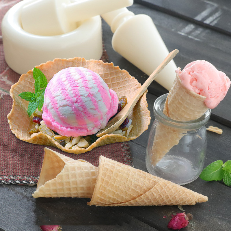 Name: Ice Cream Bowl/Cone ShaperMaterial: food grade ABS materialFeatures: non-stick surfaceStyle: flower type/cone typeApplication: cone wrapper/spring roll wrapper