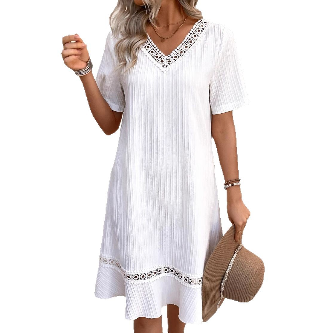 Product information:Color: White Waist Type: Mid waist Size: S,M,L,XL,XXL Combination form: Single piece Popular elements: lace Fabric name: Polyester Fiber Sleeve length: short sleeve Skirt Category: Dress Craft: collage/stitching