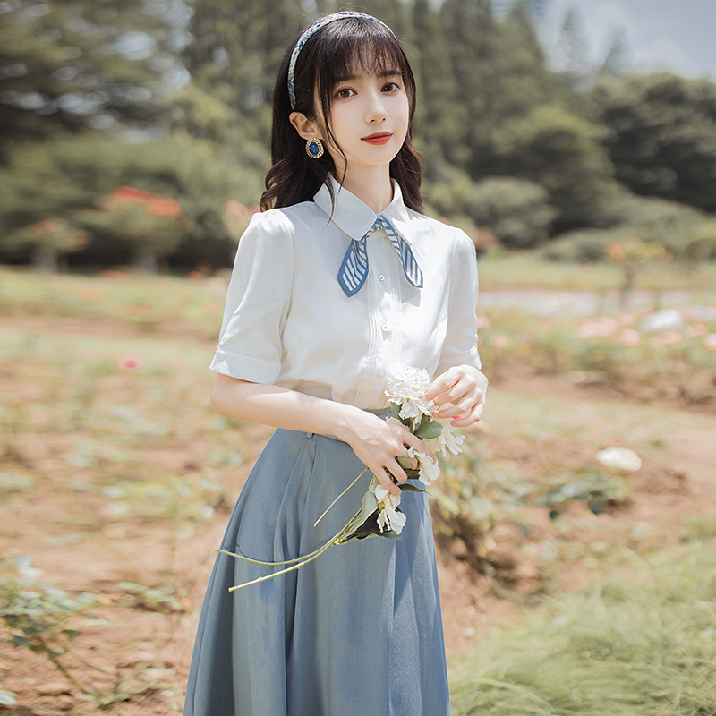 Color classification: White top + blue skirt two-piece suit