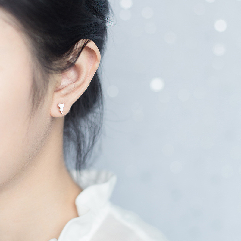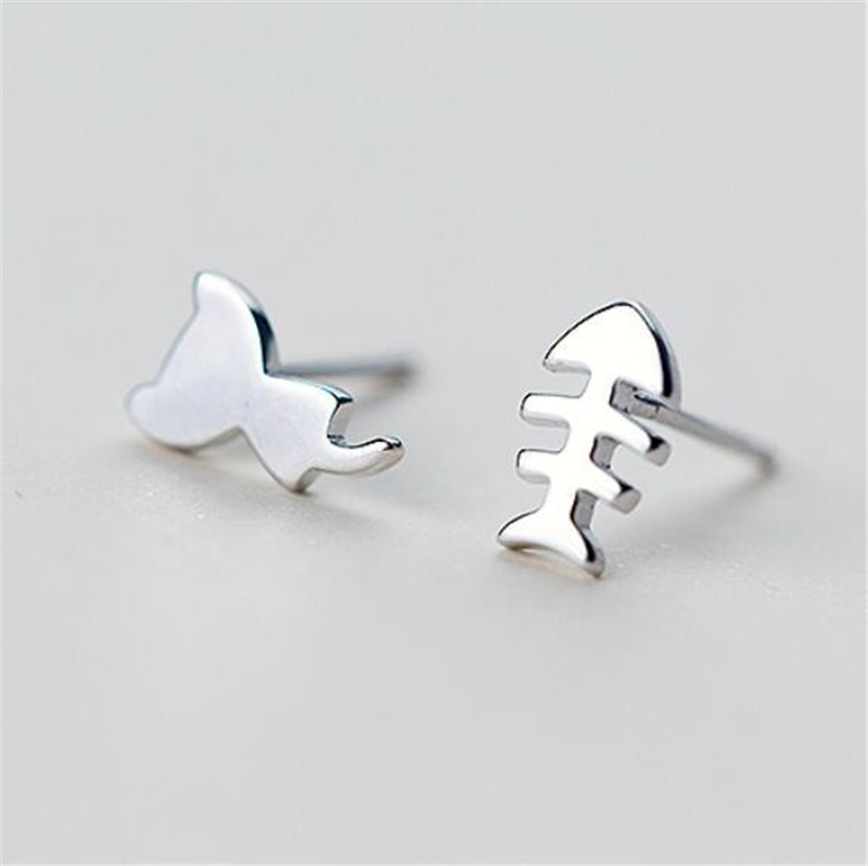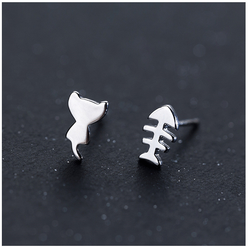 S925 Silver Earrings Cute Cat Fish Bone Asymmetric Earrings