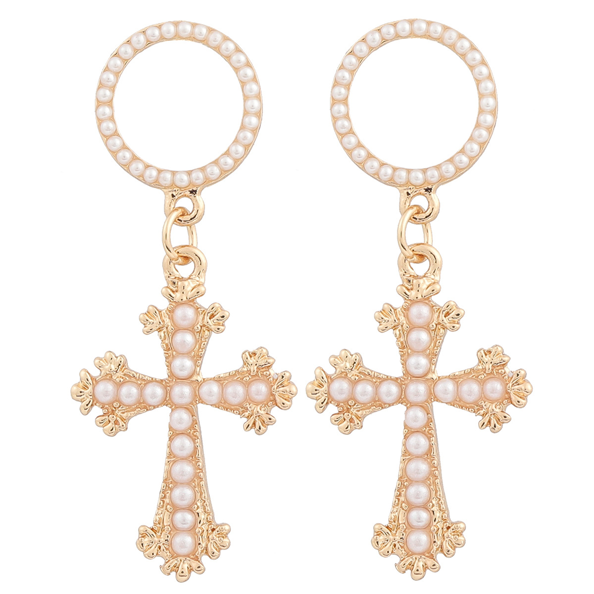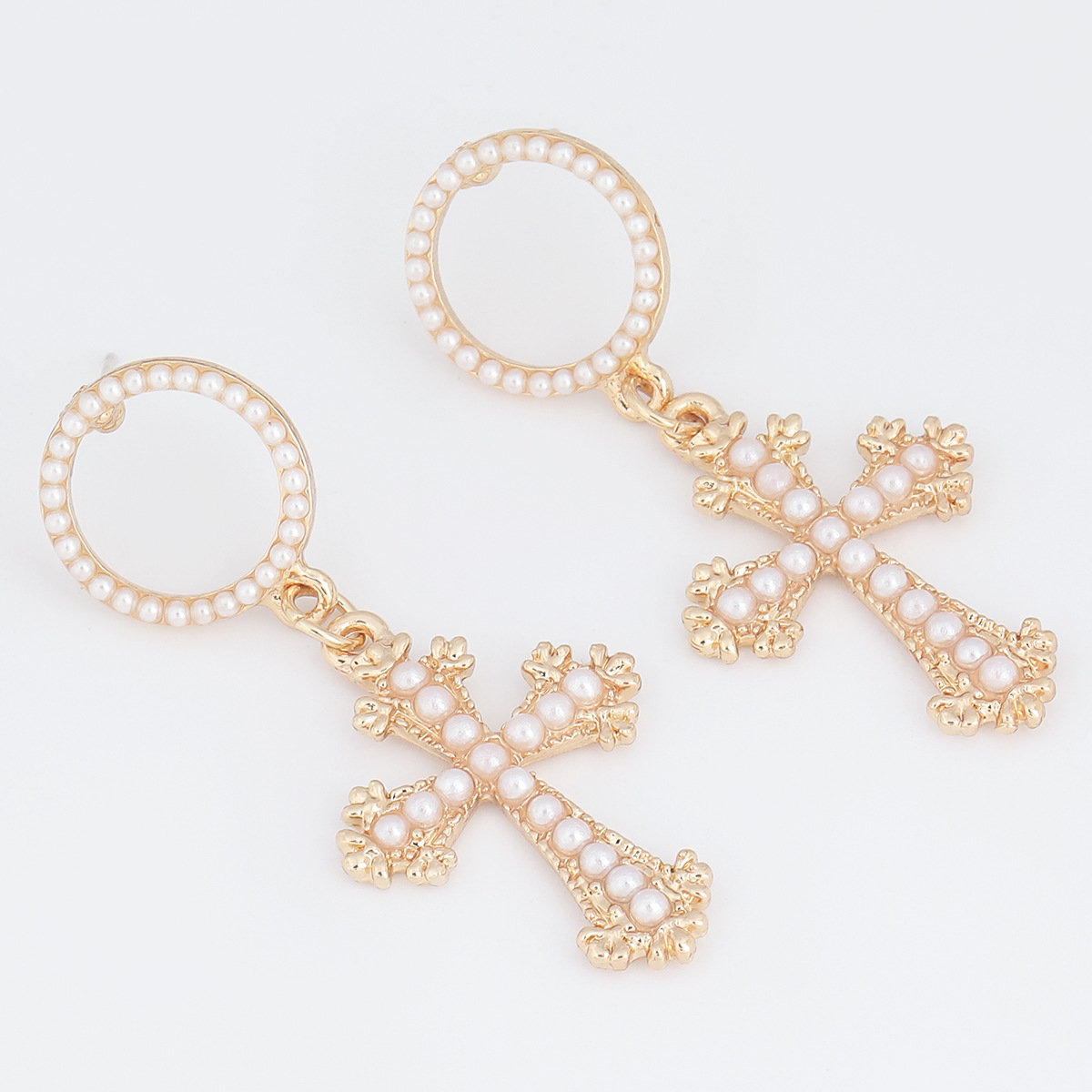 Product information:Material: Gold-plated alloyStyleStyle: Women'sModeling: CrossTreatment process: inlaid with pearlsInlay material: alloy inlaid artificial gems/semi-precious stonesColor: goldenPackaging Information:Alloy earrings x1
