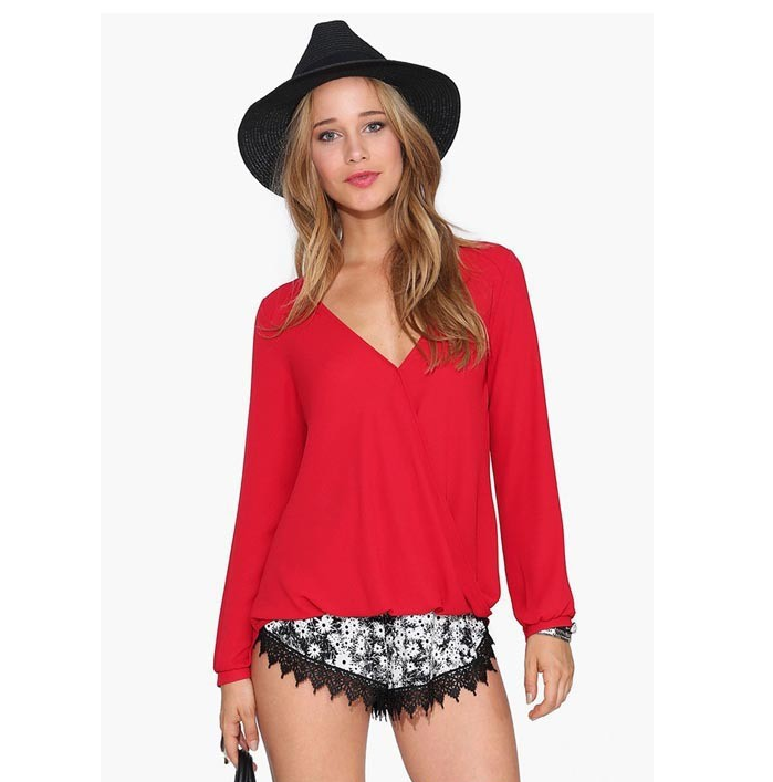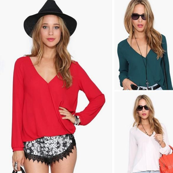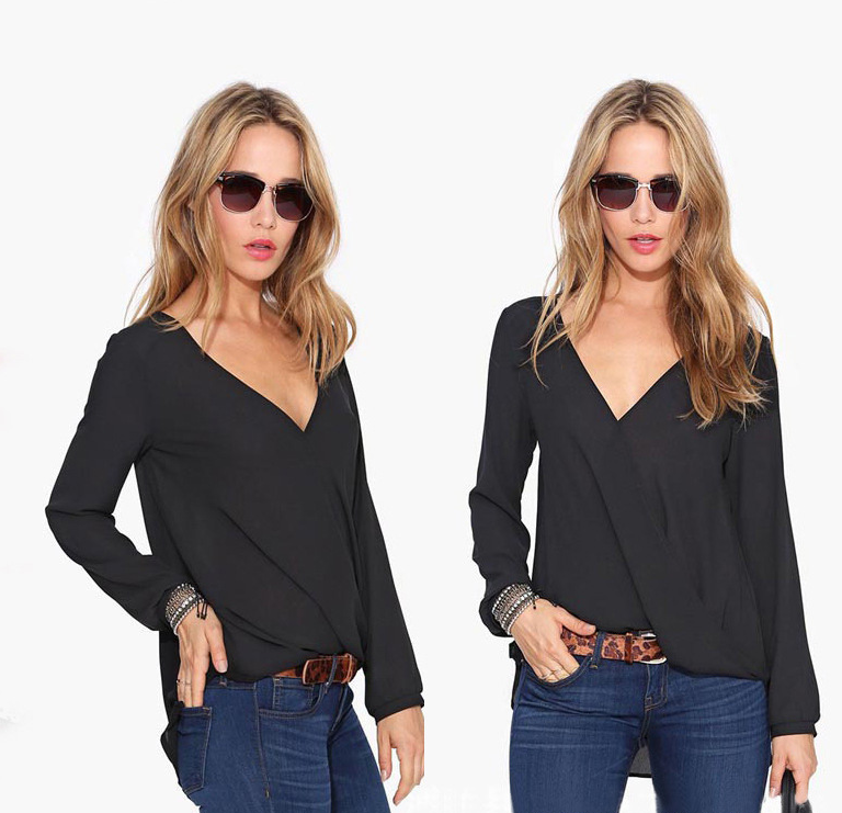 New women's European and American long-sleeved V-neck large size long-sleeved chiffon shirt