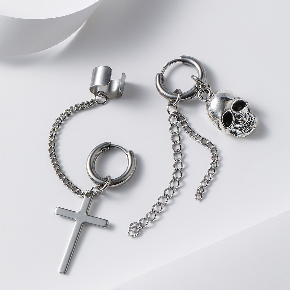 Men's Fashion Personality All-match Stainless Steel Asymmetric Cross Skull Earrings