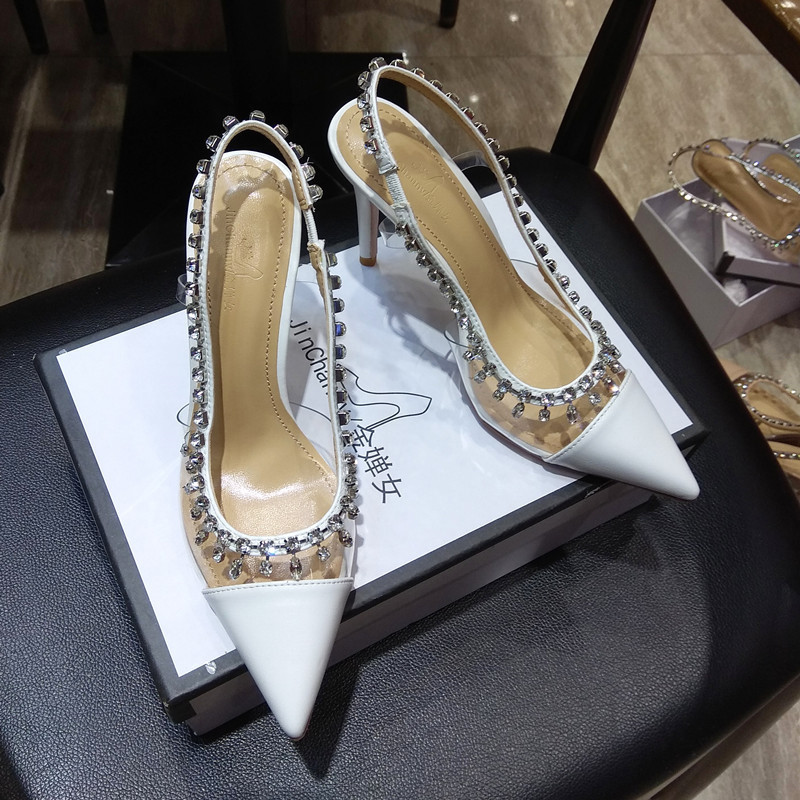 Upper: Patent leather and transparent PVC soft glue stitching, rhinestone stitchingInsole; SheepskinHeel height: 10 cmSole: rubber sole (wear-resistant and non-slip)