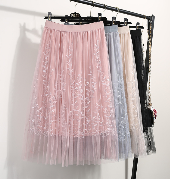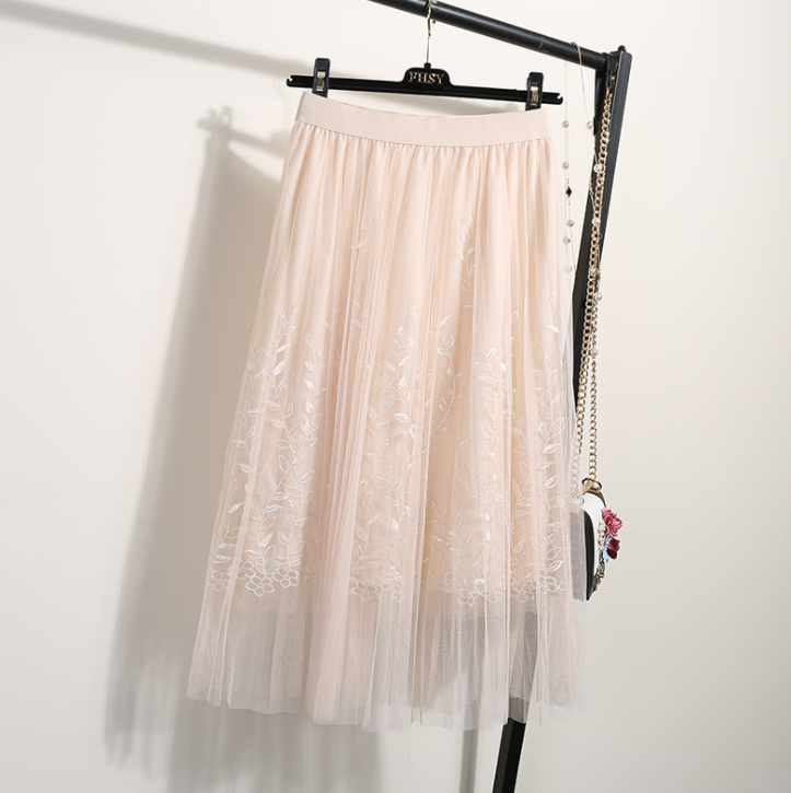 Elegant Tulle Floral Embroidery A-line Mesh Midi Skirt