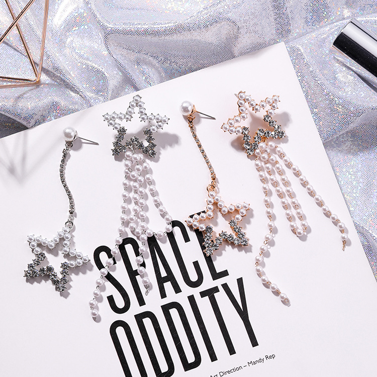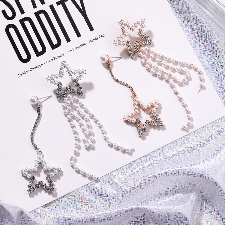 Five-pointed Star Diamond Pearl Asymmetrical Earrings Personality Retro Long Earrings Simple Fringed Female Earrings