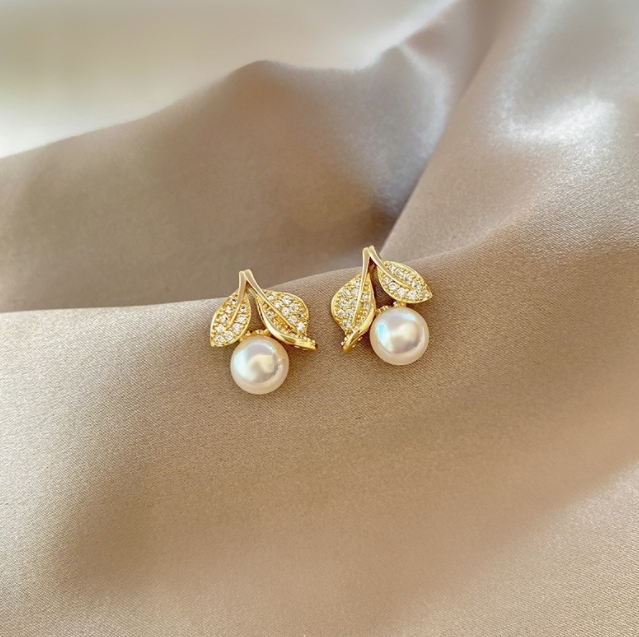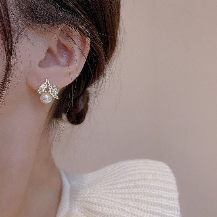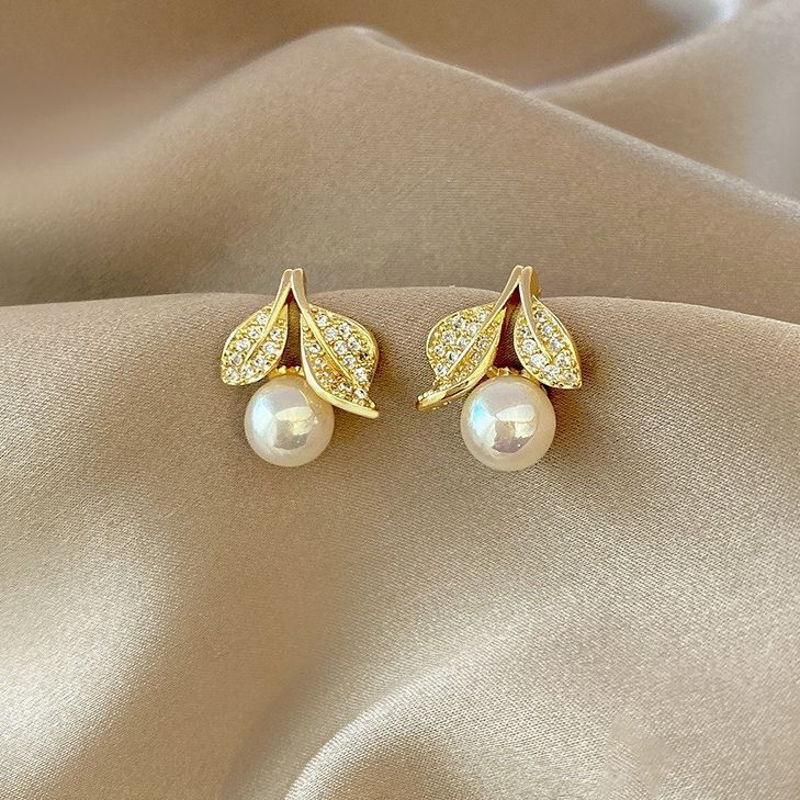 Exquisite Micro-inlaid Leaves Female All-matching Graceful Light Luxury Minority Pearl Stud Earrings