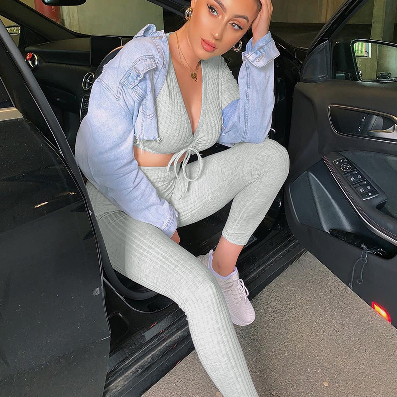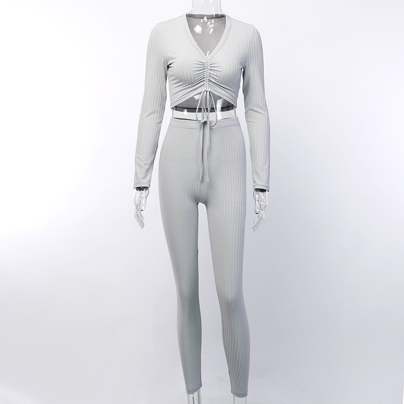 Two piece set of drawstring pit stripe V-neck T-shirt trousers