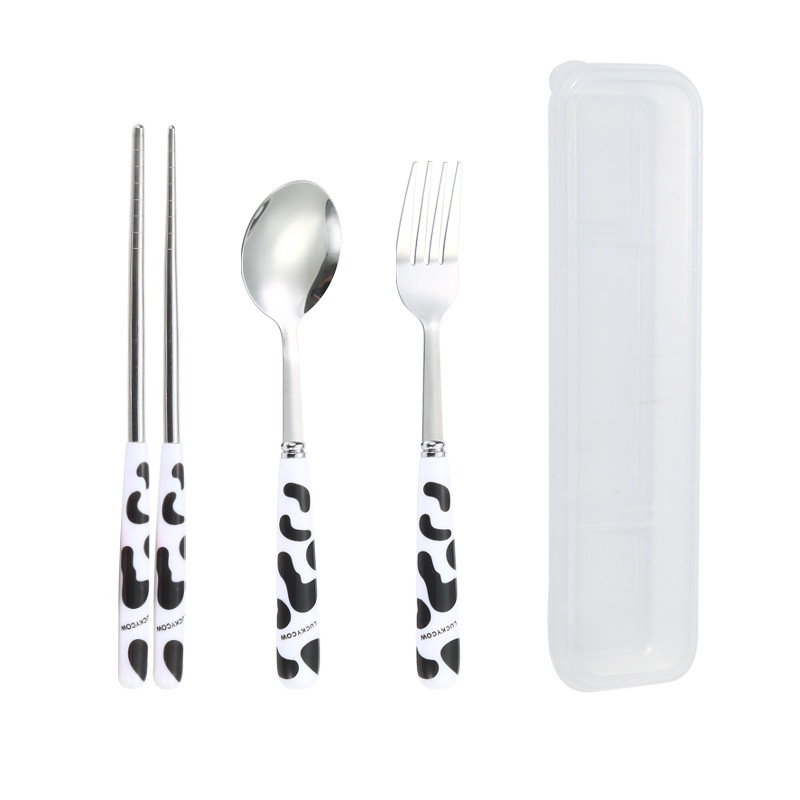 Specifications: Puppy three-piece set [spoon Fork chopsticks] with box, Black Cow three-piece set [spoon Fork chopsticks] with box, pink cow three-piece set [spoon Fork chopsticks] with box, Baibao blue cat three-piece set [spoon Fork chopsticks] with box, bow cat three-piece set [spoon Fork chopsticks] with box