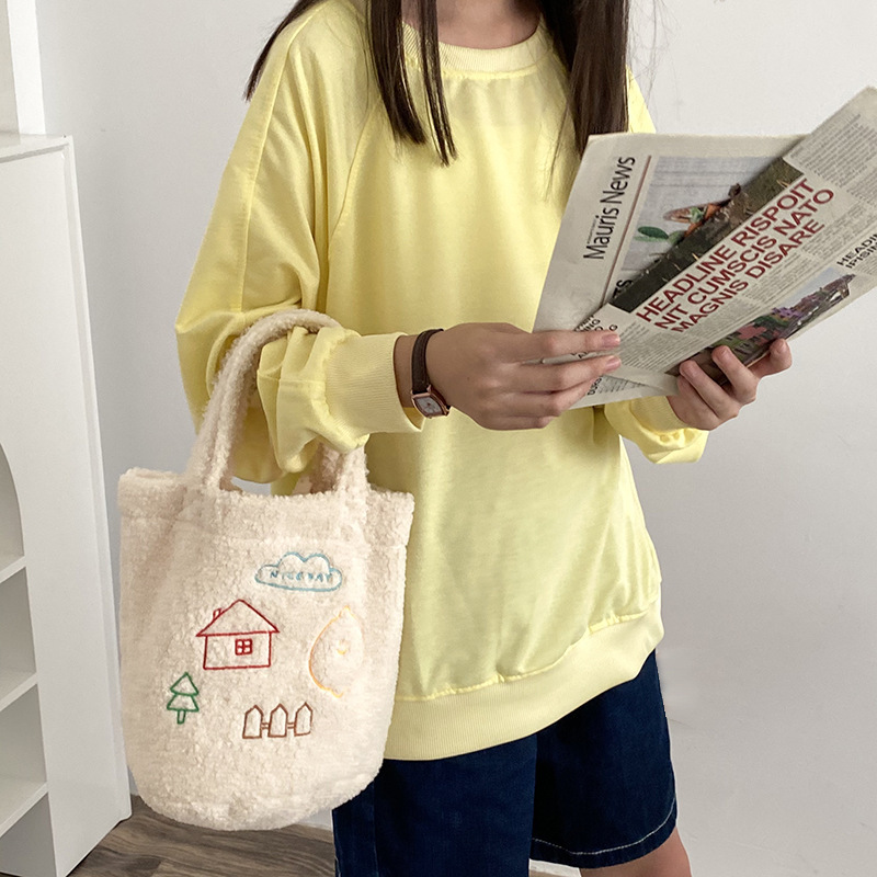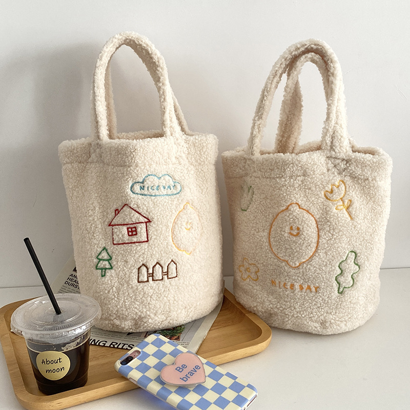 Product information :Color: cute embroidered bucket bag lemon, cute embroidered bucket bag small houseMaterial: plushTrendy bag style: bucket bagSize Information: