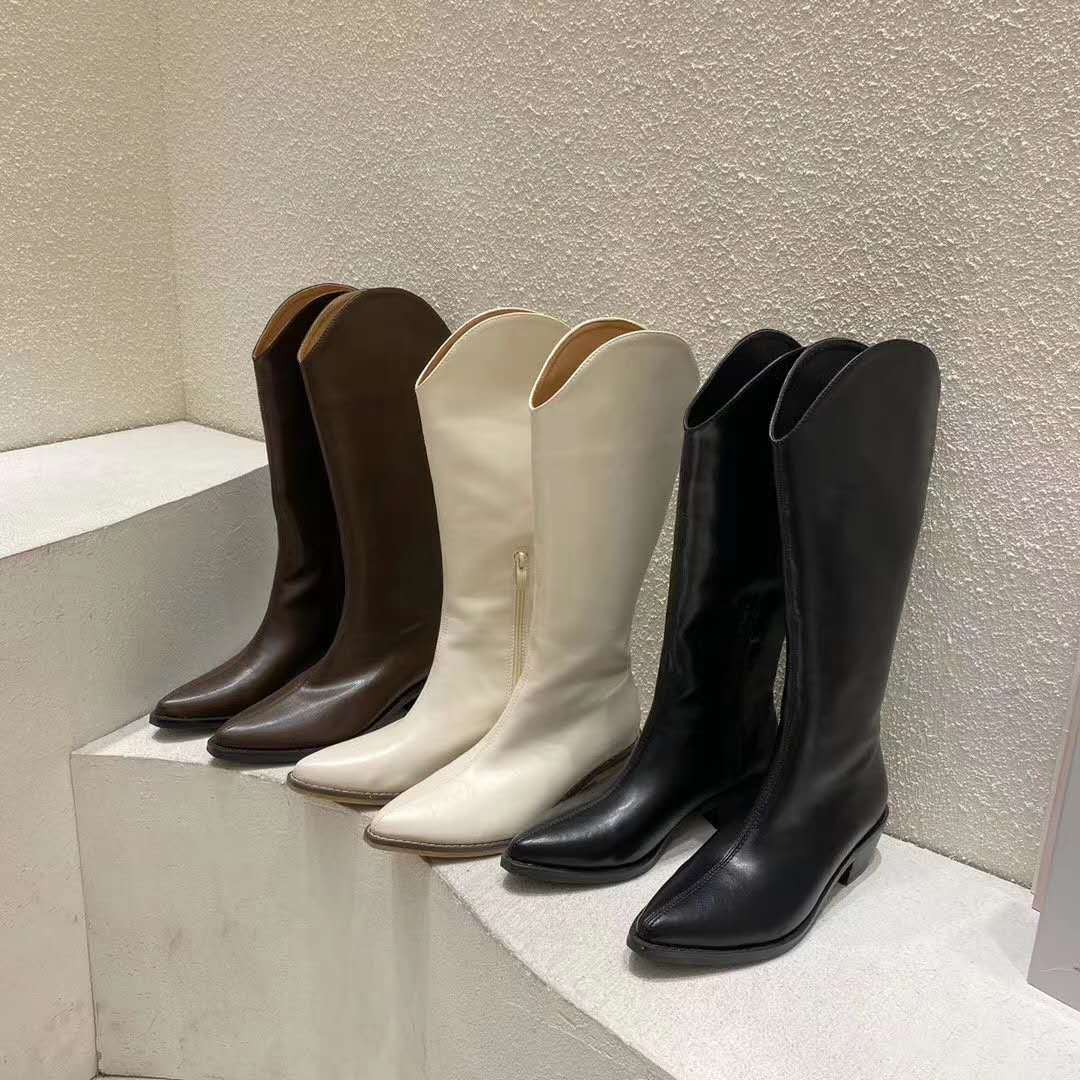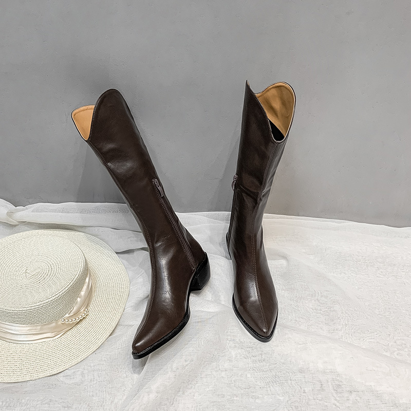 Sole Material: RubberToe shape: pointedHeel shape: thick heelHeel height: middle heel (3-5CM)Tube height: high tubeThickness: ordinary thickWearing style: sleeve/overshoesInsole material: PU
