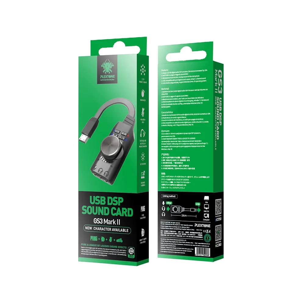 • أبرز الميزات: صوت محيطي افتراضي 7.1 قناة || معالج إشارة صوتية رقمي 24 بت || مفتاح مباشر لتأثيرات صوتية من PUBG و League of Legends || وظيفة كتم صوت الميكروفون - إيقاف تشغيل بمفتاح واحد || التوصيل والتشغيل، تثبيت تلقائي || منفذ 3.5 ملم: بطاقة صوت USB